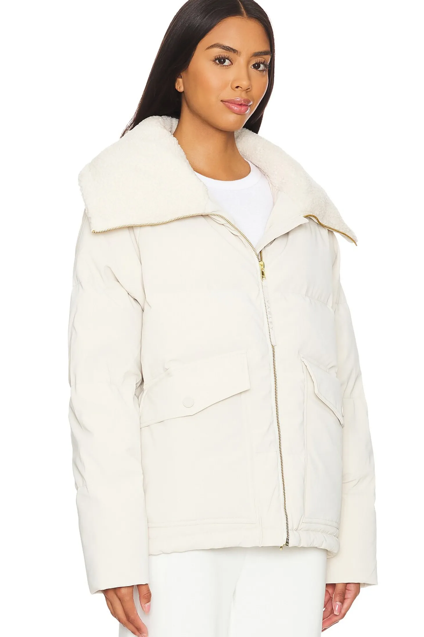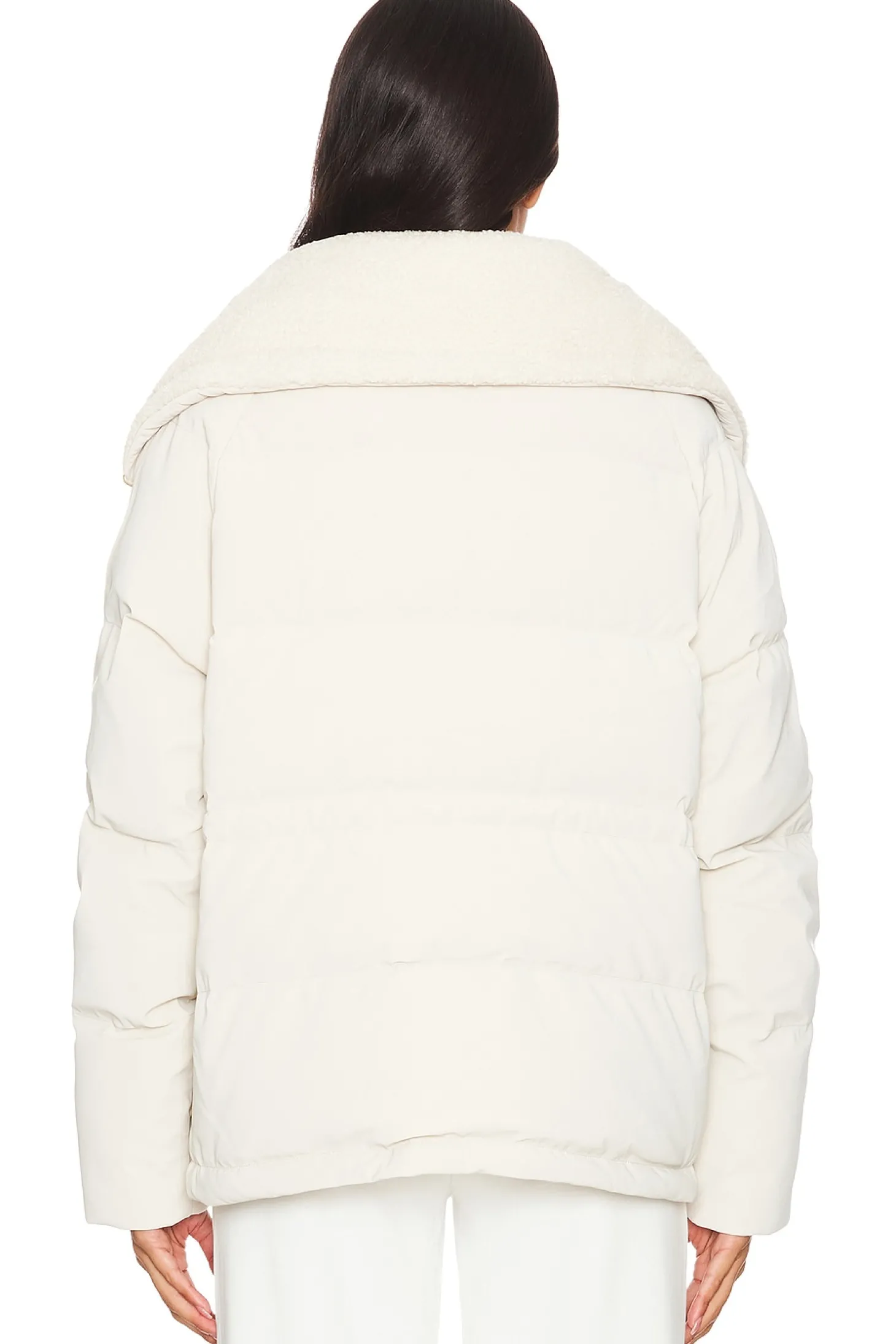Self: 75% polyester 25% polyurethane Lining: 100% polyamide Faux Fur: 100% polyester Filling: 95% duckdown 5% duck feather.Made in China.Wet clean only.Front zipper closure.Front pockets with snap button closure and side pockets.Padded ripstop fabric and sherpa lined collar