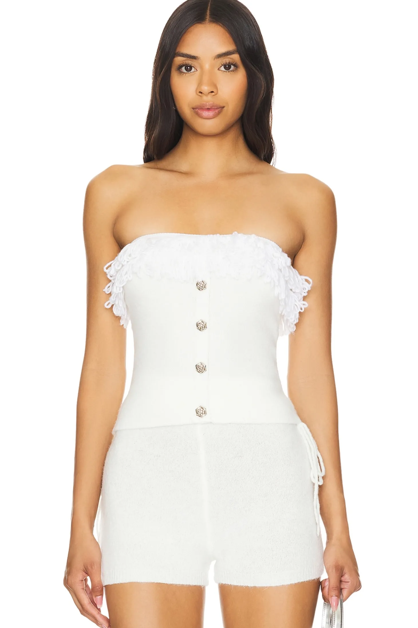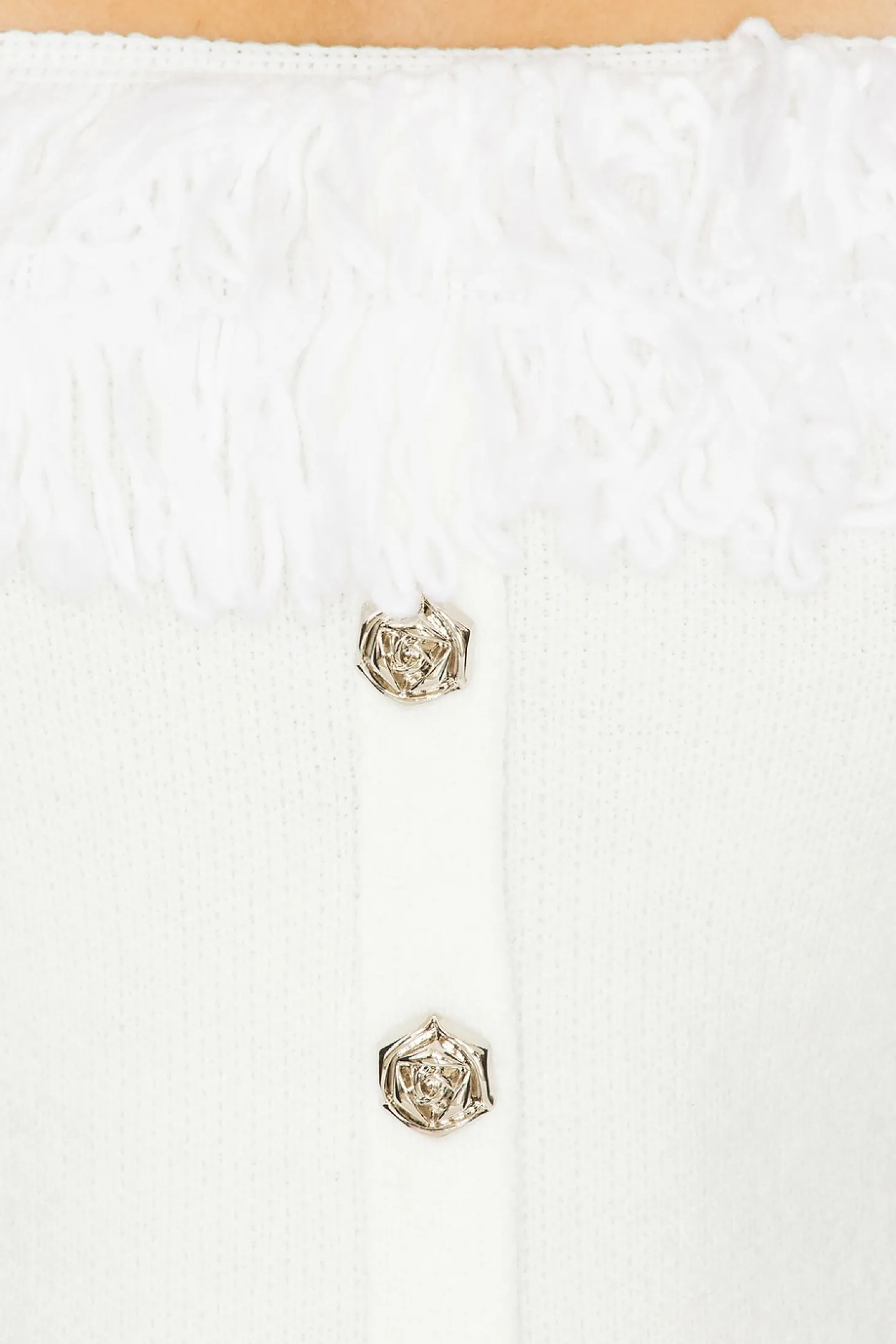 52% acrylic 28% cotton 20% polyester.Made in China.Machine wash.Front silver-tone rose button details.Fringe detail at neckline.Soft knit fabric.Item not sold as a set