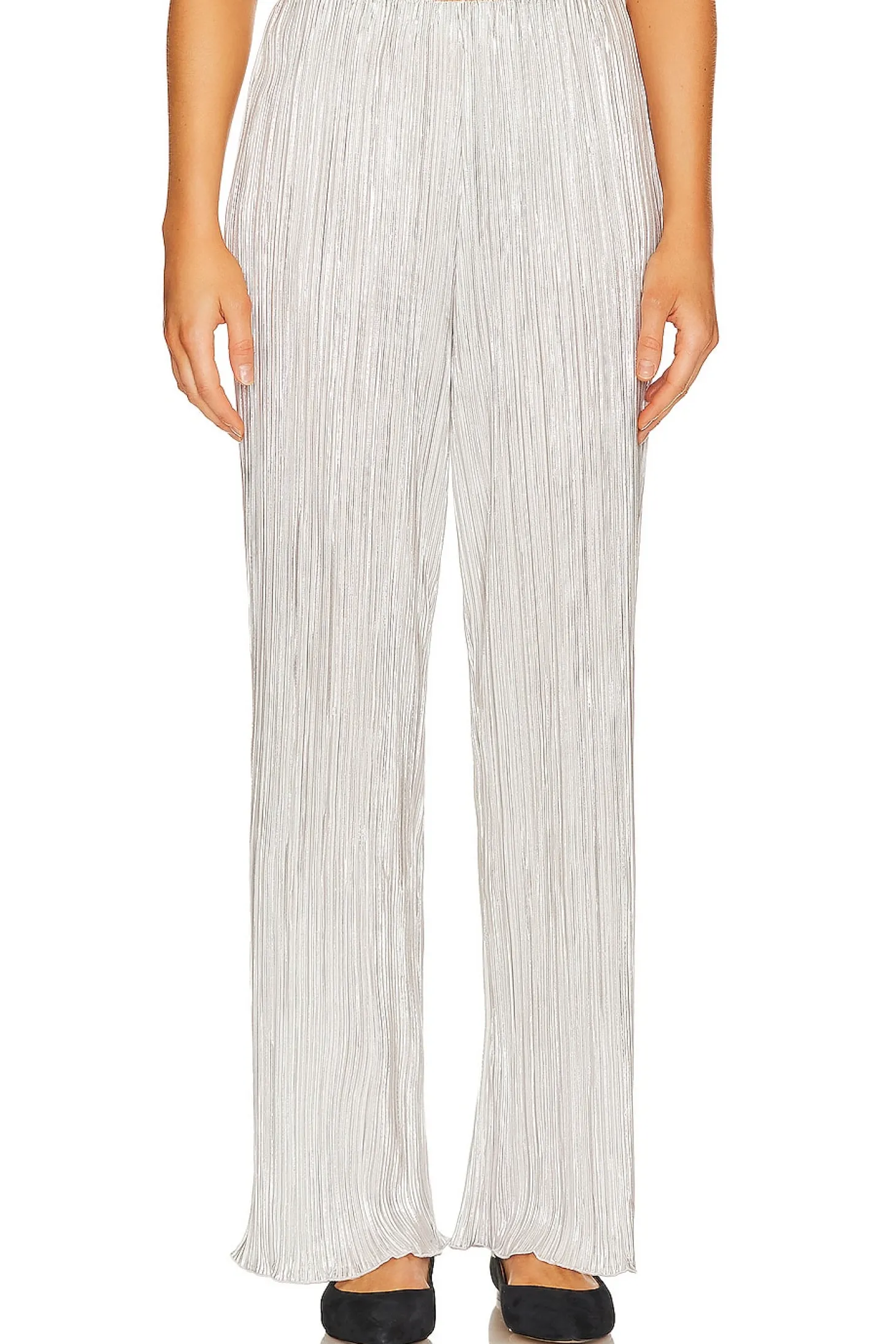 100% polyester.Made in China.Dry clean only.Elastic waistband.Plisse fabric with lettuce hem.Item not sold as a set.23" at the knee breaks to 24" at the leg opening