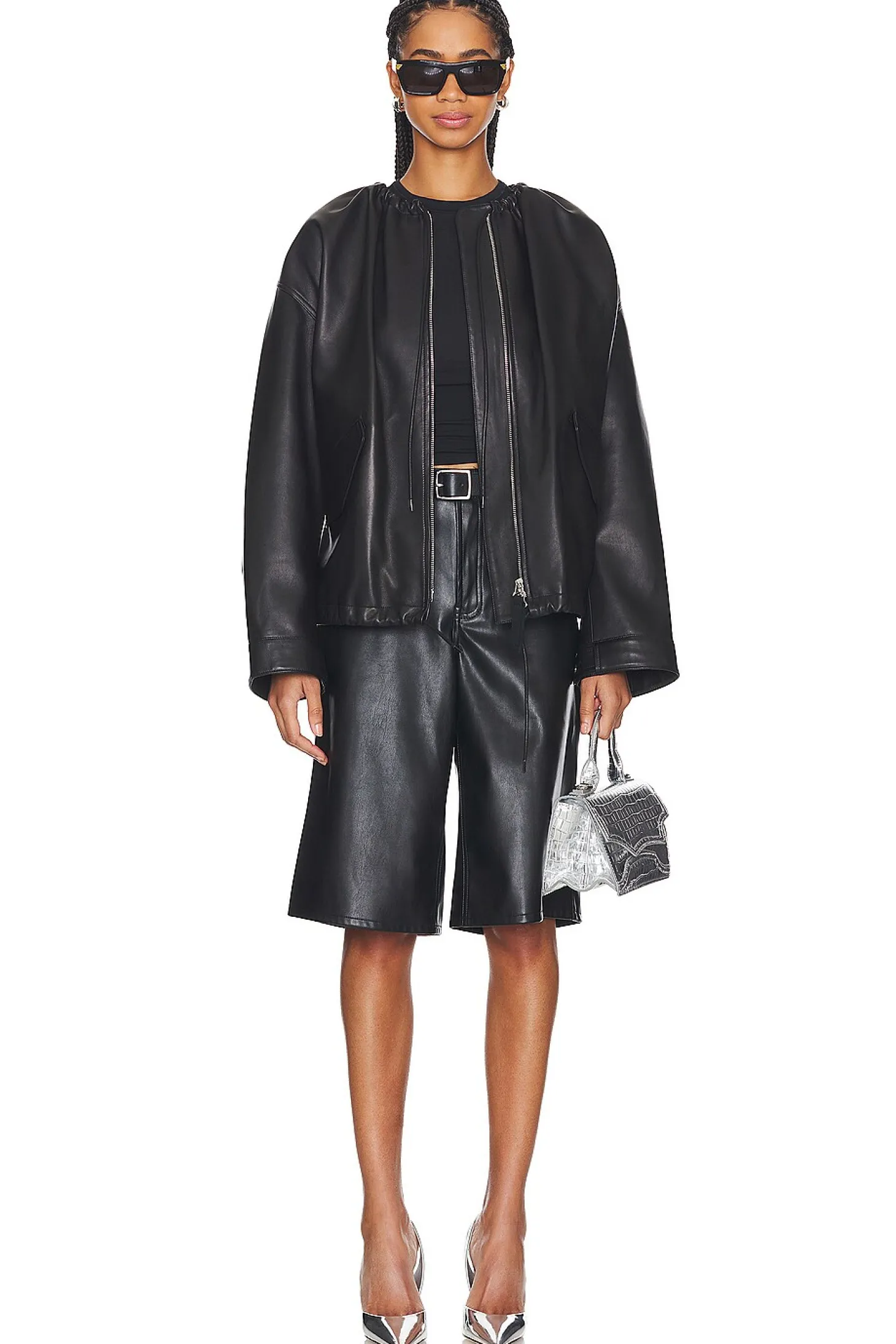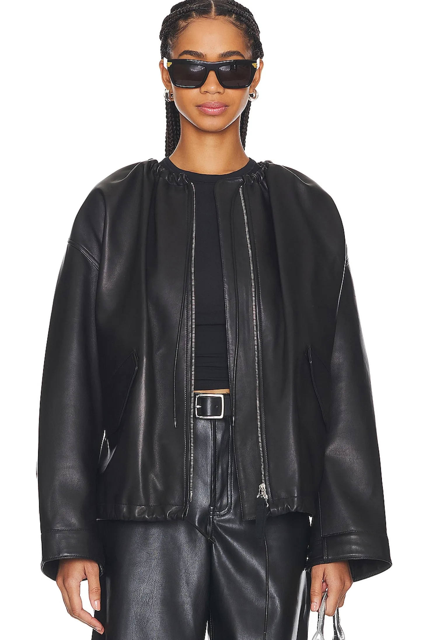 Self: 100% leather Lining: 100% viscose.Made in India.Pro Leather clean only.Front zipper closure.Draw String at neck and waistline.Side flap pockets