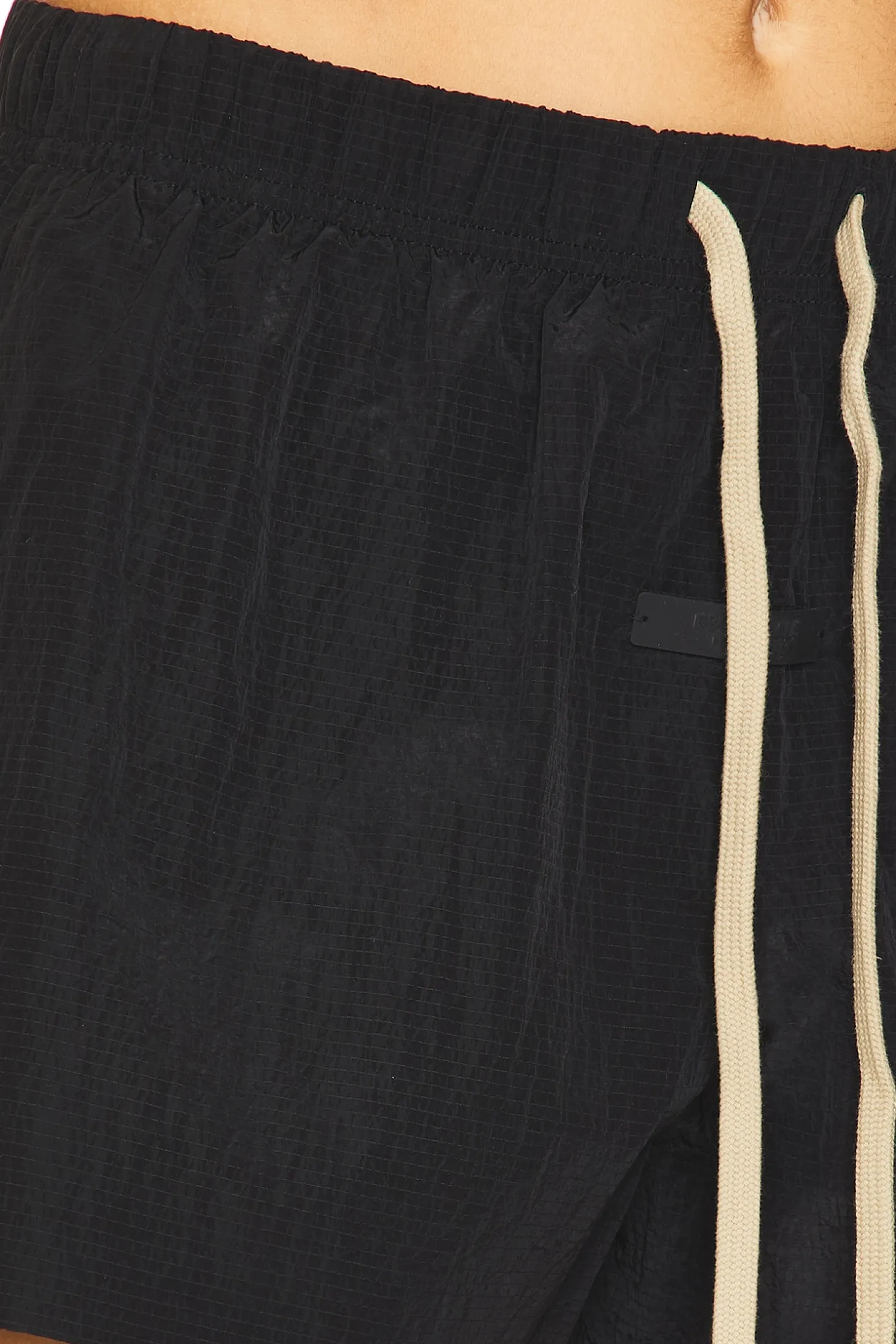 Self: 100% nylon Lining: 100% polyester.Made in China.Hand wash.Drawstring closure.Side slit pockets.Ripstop fabric.Shorts measure approx 11.5" in length