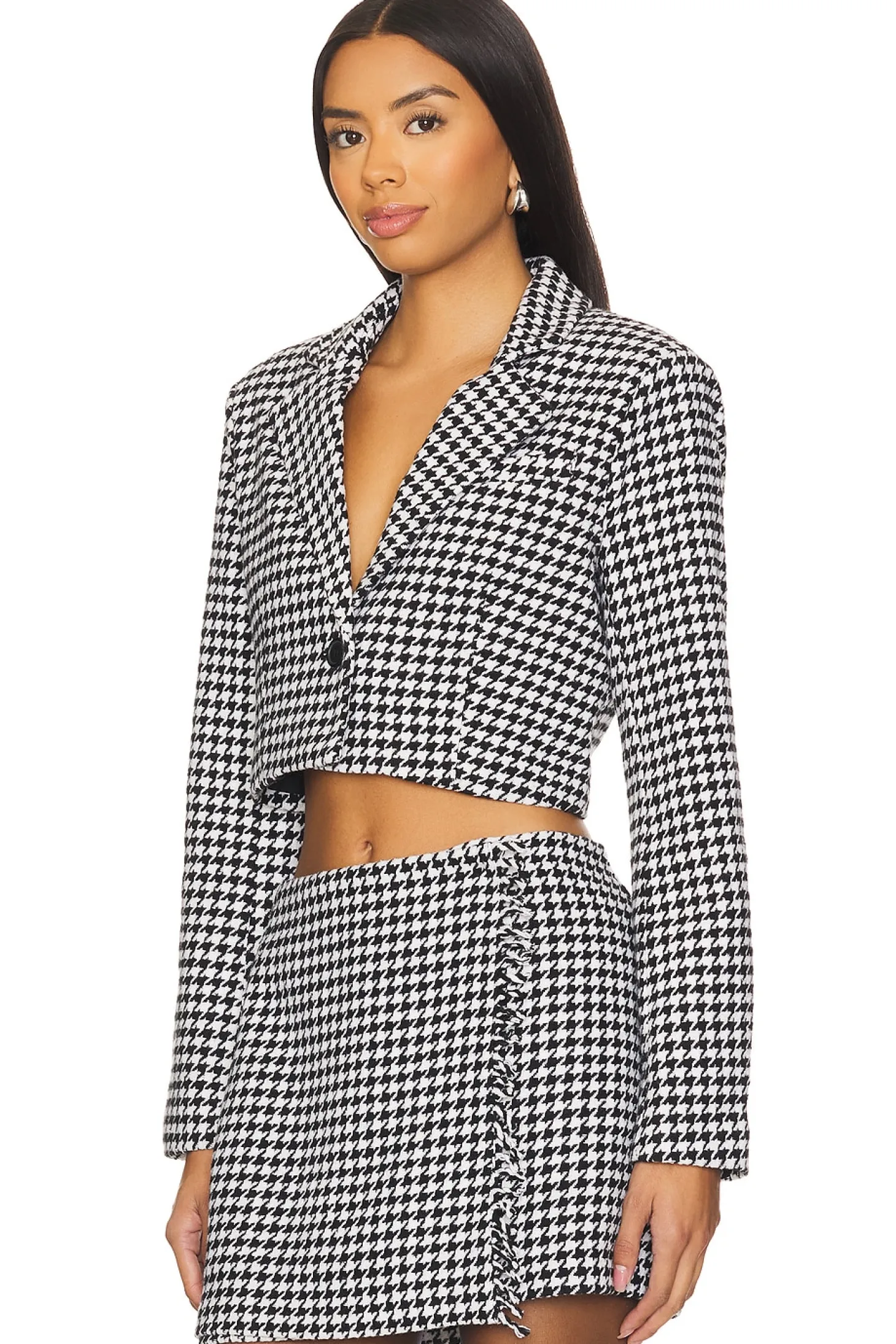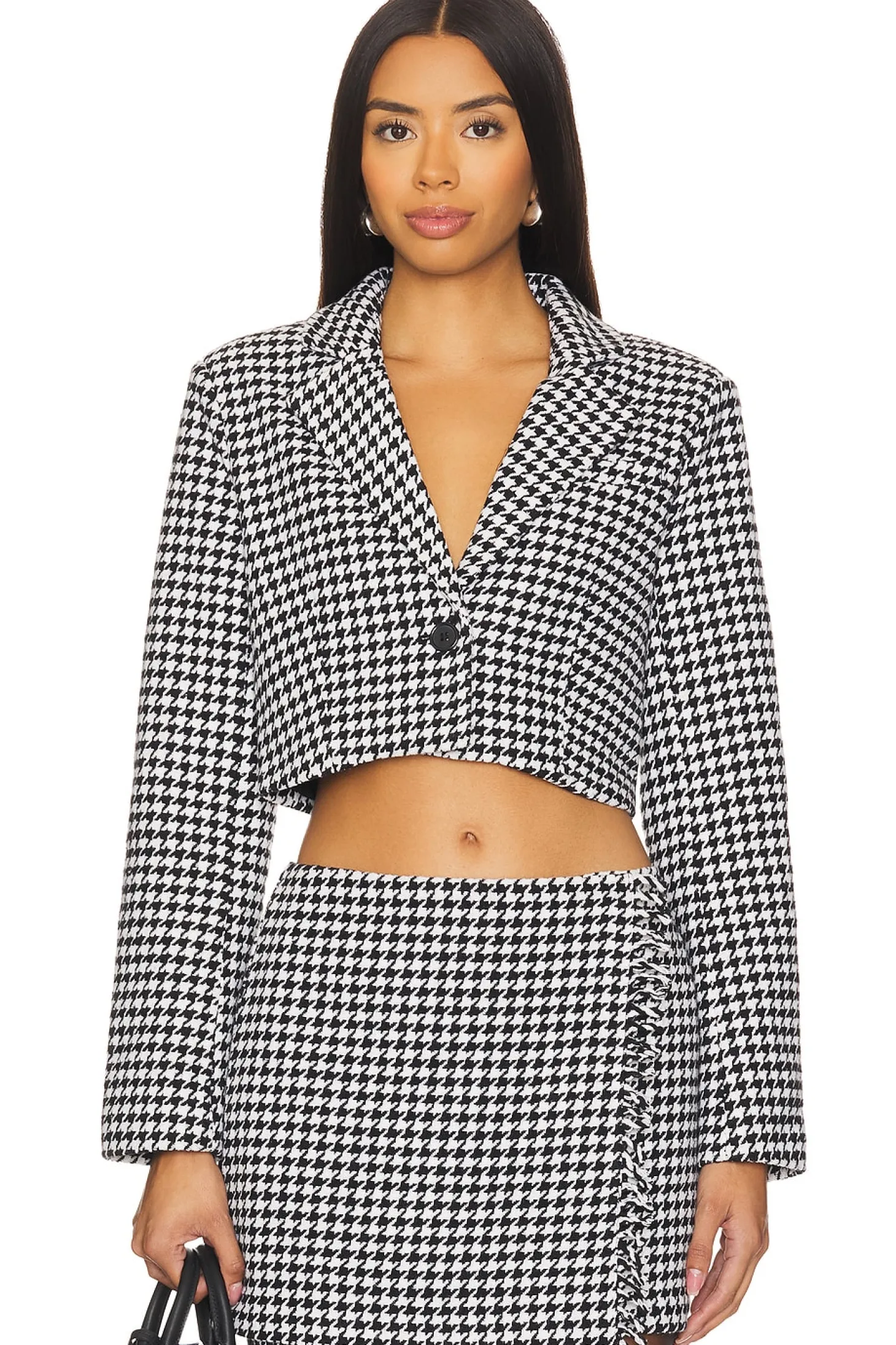 Self: 53% polyester 14% rayon 12% acrylic 9% nylon 9% cotton 3% wool Lining: 100% polyester.Made in China.Machine wash.Front button closure.Lapel collar.Cropped styling