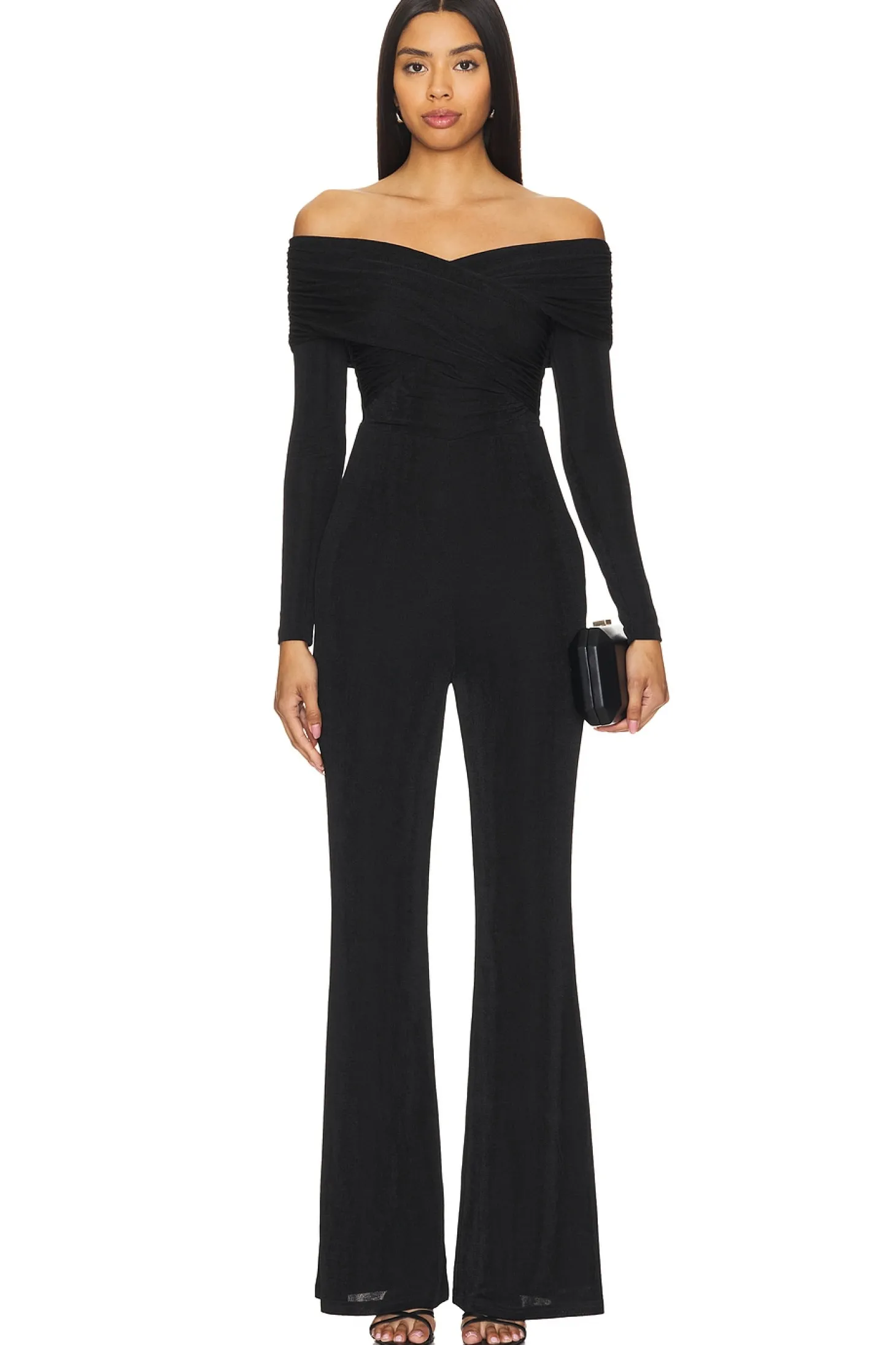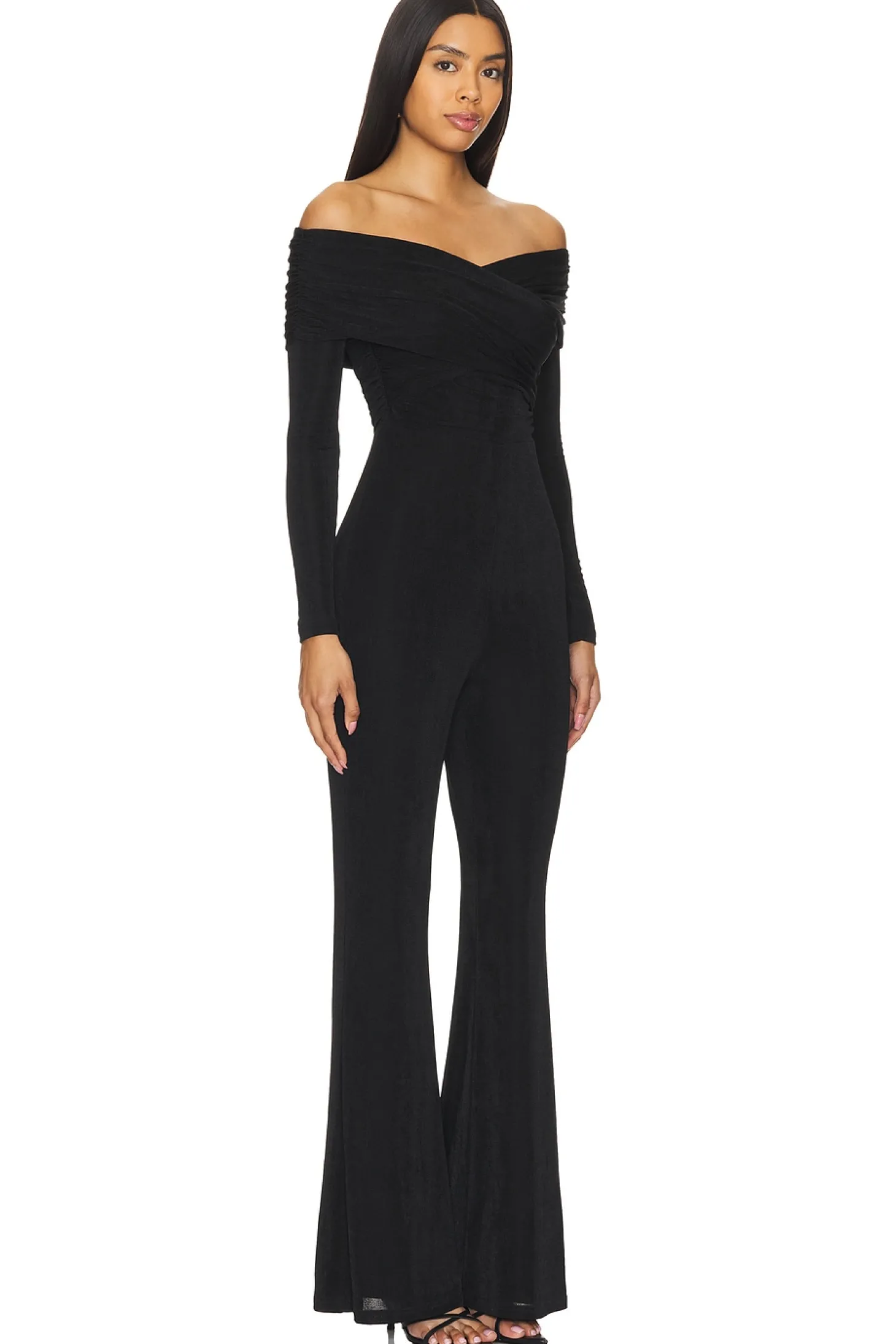 Slinky jersey textile.Imported.Dry clean recommended.Hidden back zipper closure.Off the shoulder styling.Midweight ruched fabric.Neckline to hem measures approx 60" in length 22" at the knee and 22" at the leg opening