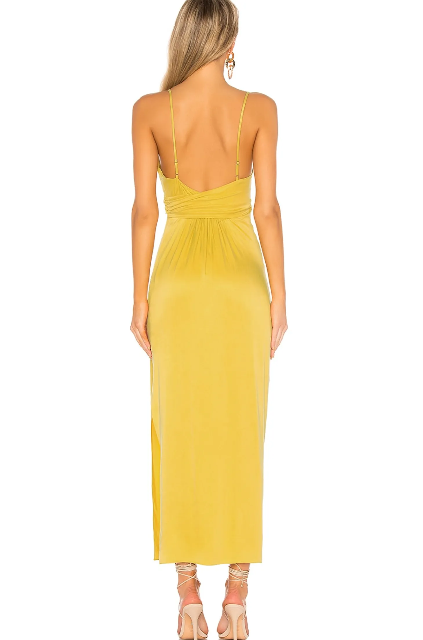 Self: 53% rayon 47% cupro.Hand wash cold.Unlined.Adjustable shoulder straps.Ruched detail with side slit.Hidden side zipper closure.Imported