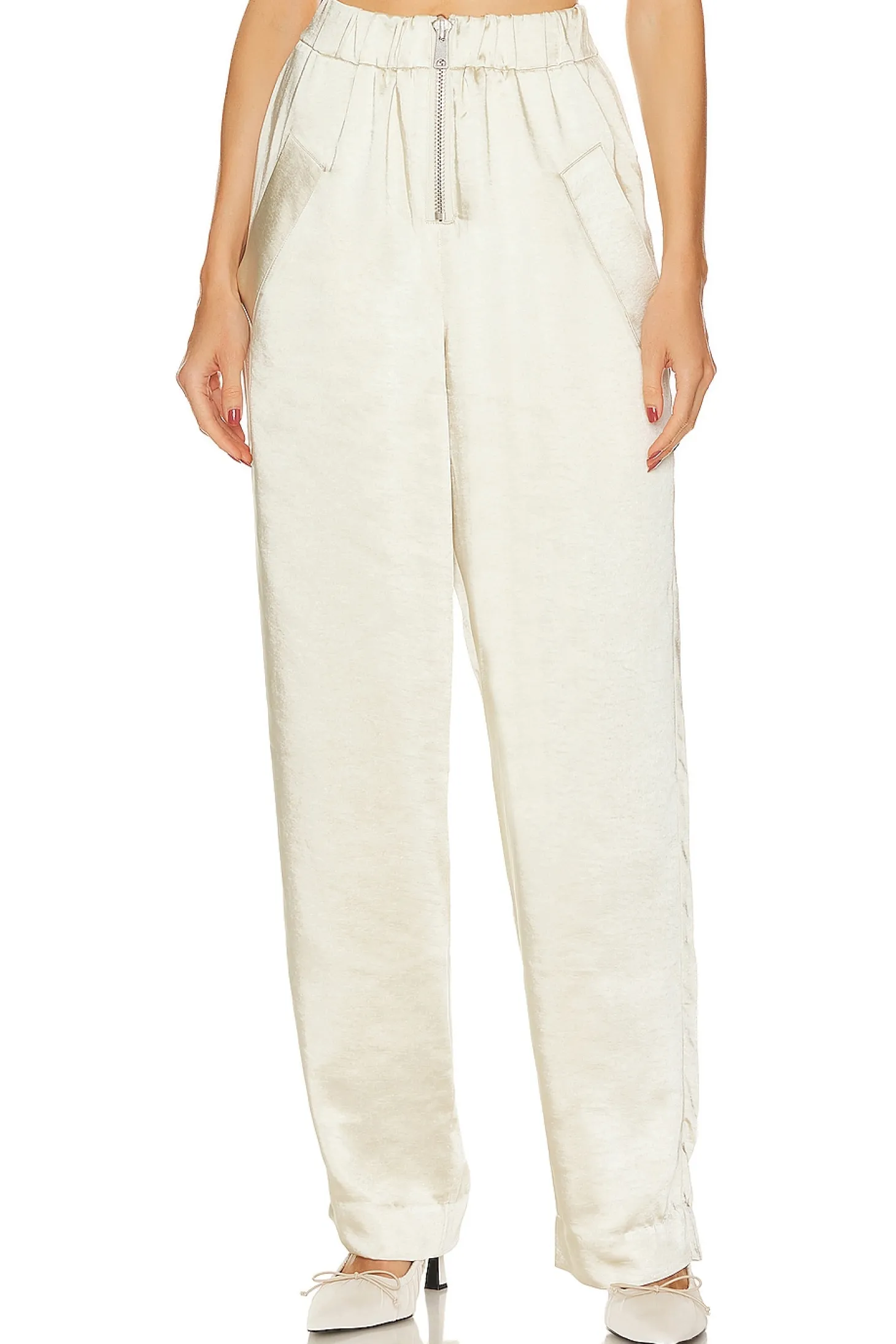 100% polyester.Made in China.Hand wash.Zip fly.Side slant pockets.Lightweight satin fabric.Item not sold as a set.20" at the knee narrows to 18" at the leg opening