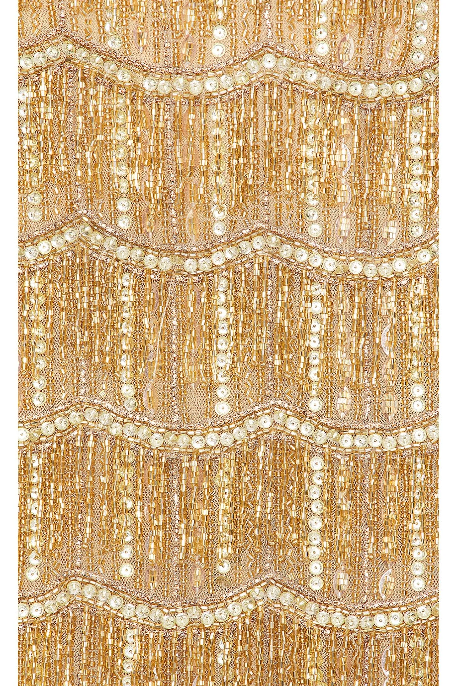 Mesh blend.Imported.Dry clean recommended.Double lined.Hidden back zipper closure.Heavyweight bead and sequin embellished fabric with back vent
