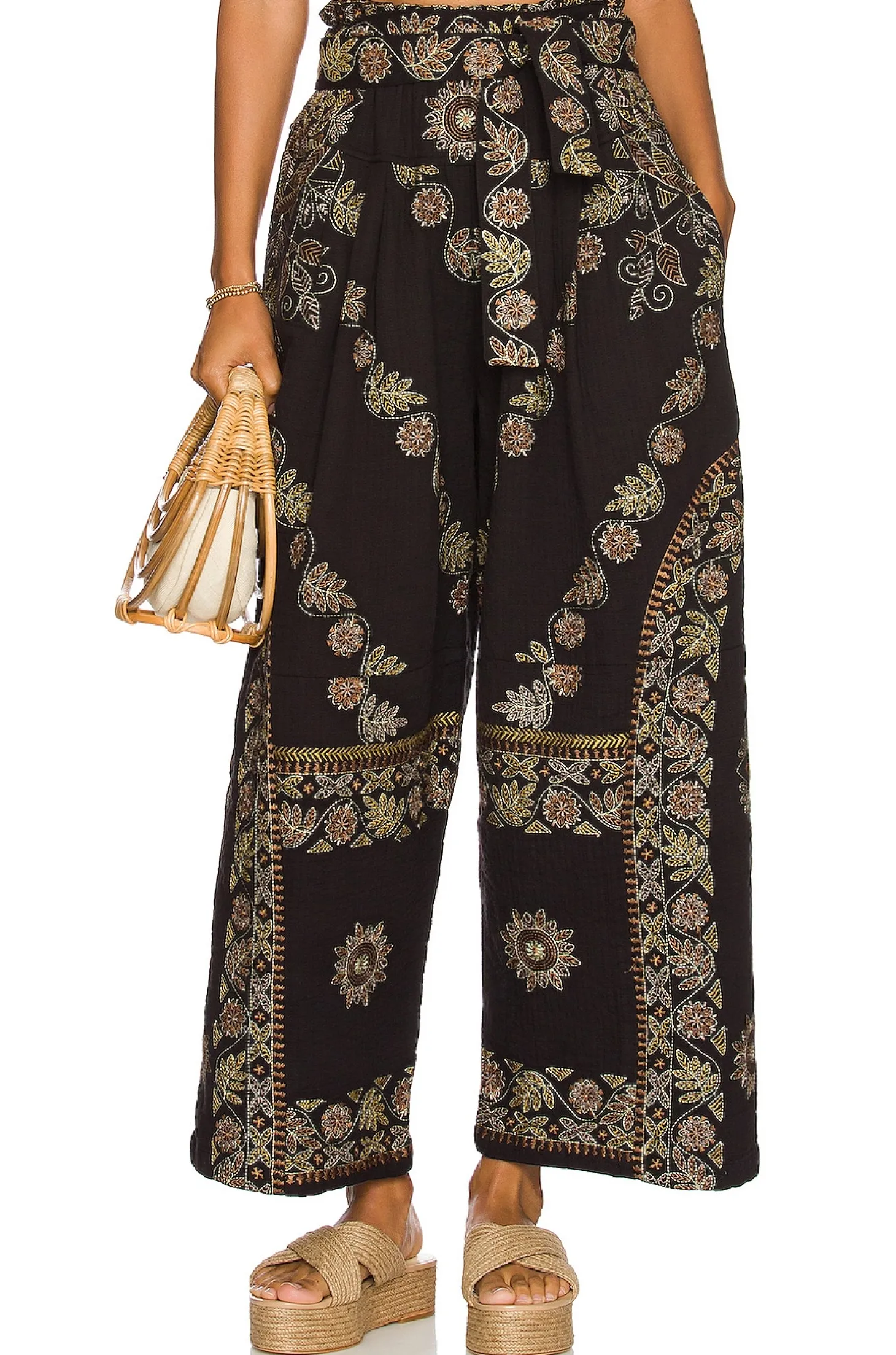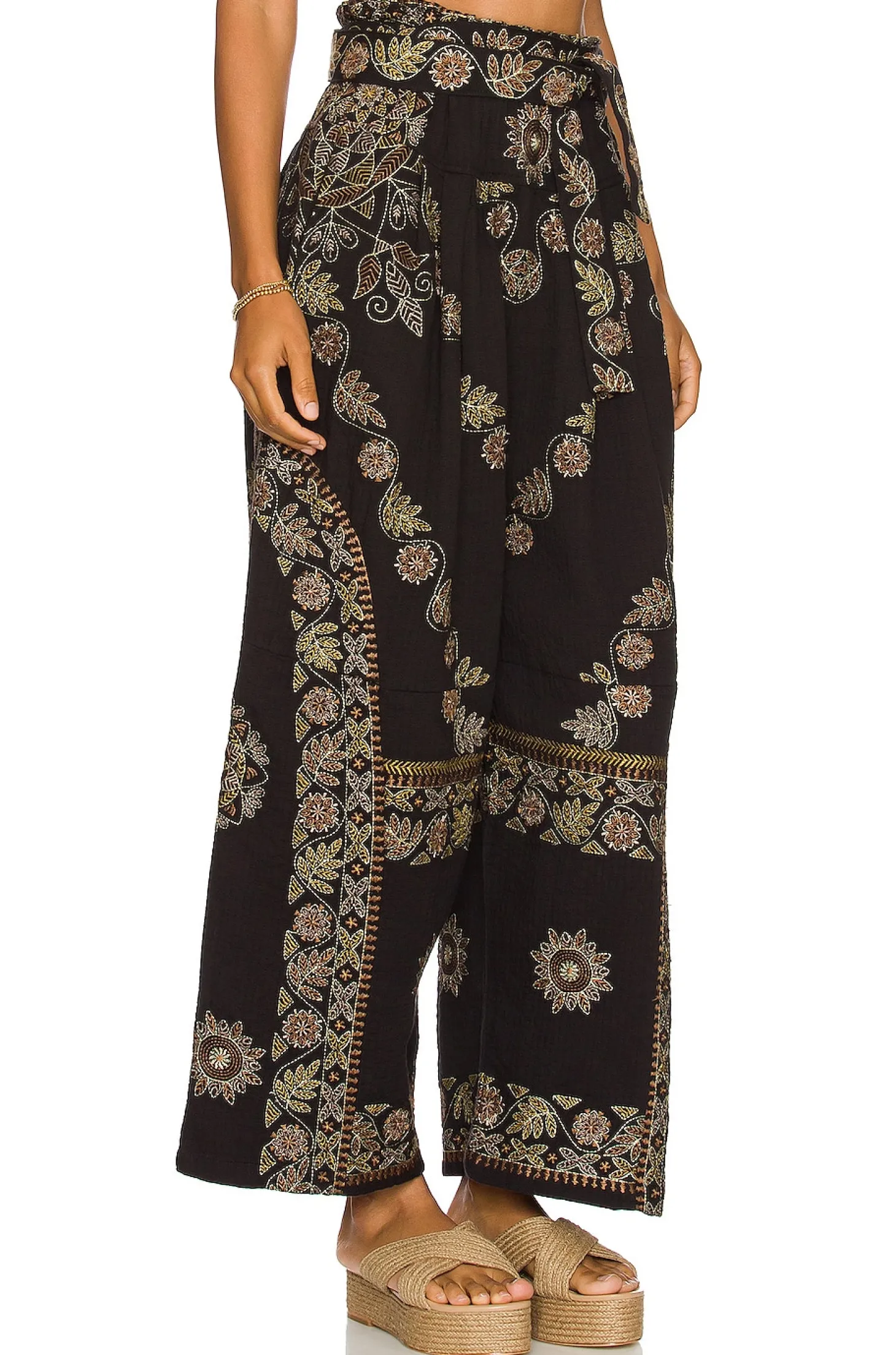Self: 100% cotton Embroidery 100% viscose.Made in India.Hand wash.Elastic waistband with detachable waist tie closure.Side slant pockets.Embroidery detail throughout.30" at the knee narrows to 24" at the leg opening