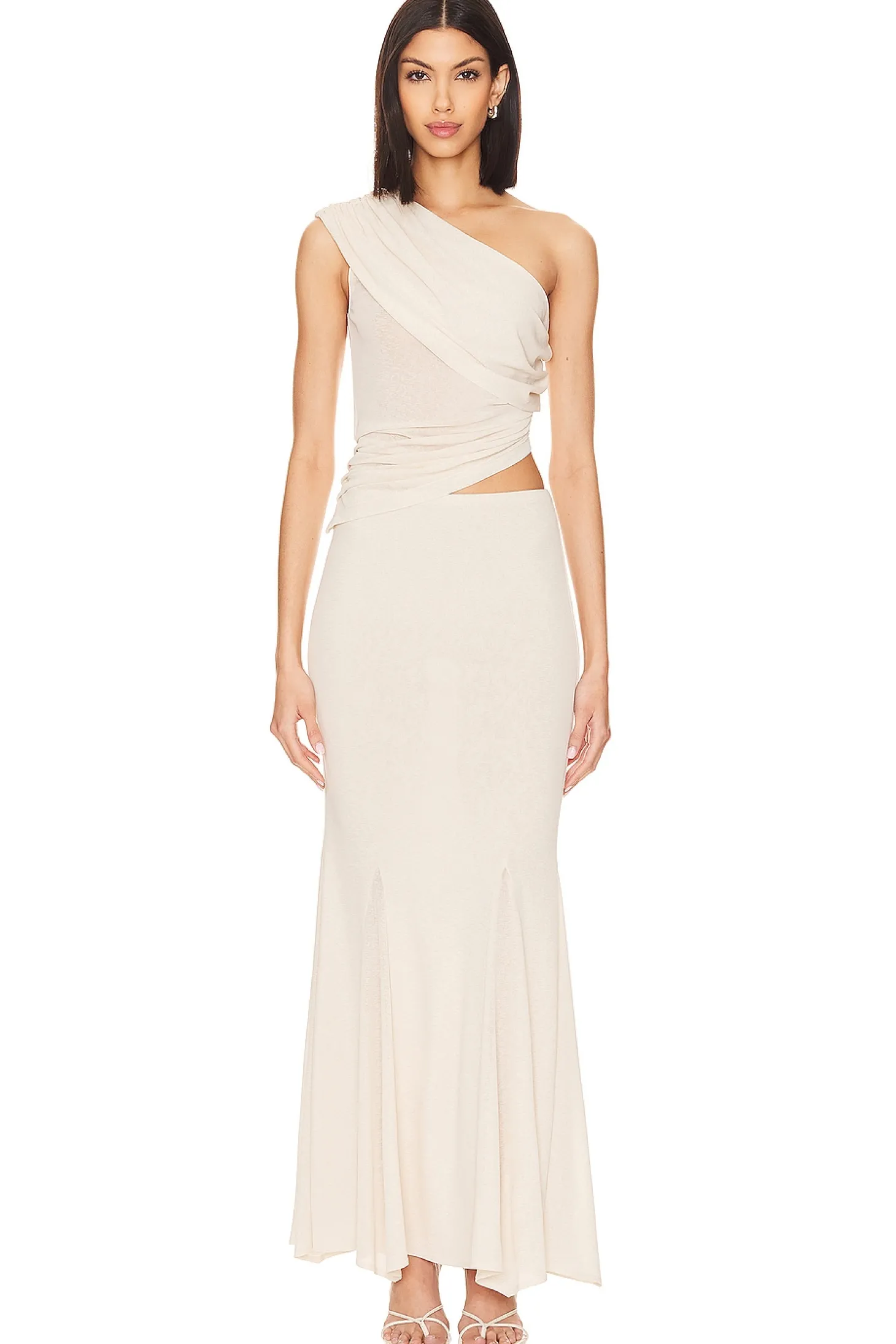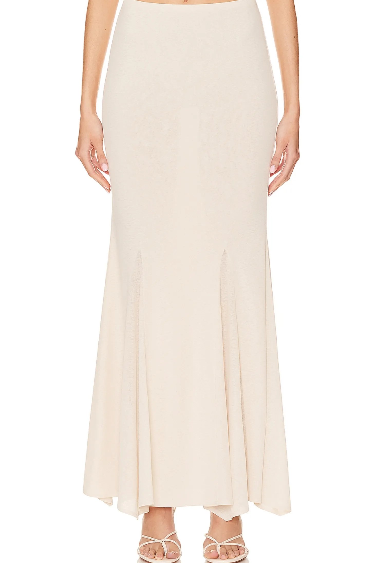 Every girl needs a timeless skirt. Meet the NBD Sanam Maxi Skirt in Cream. This romantic crepe piece is your go-to for an evening of charm. With its neutral color, it's the epitome of clean girl chic. Elevate your style, be radiant- grace awaits..100% polyester.Made in China.Dry clean only.Unlined.Pull-on styling with elastic waistband.Ribbed crepe fabric v.Skirt measures approx 42" in length