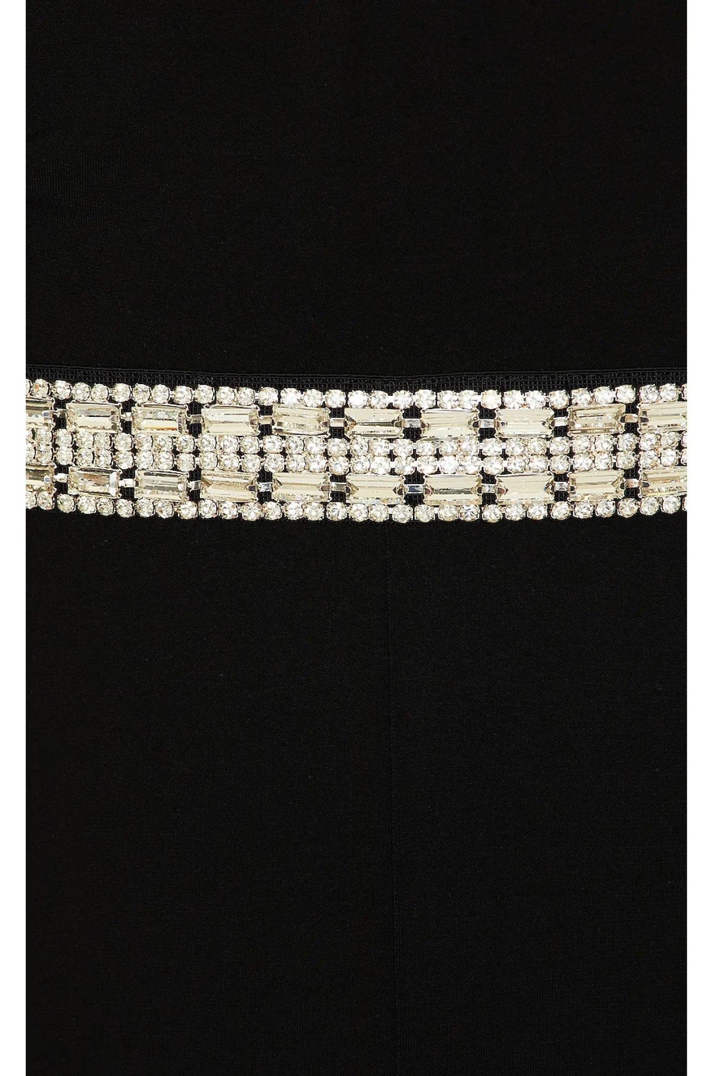 Self: 85% polyester 15% spandex Lining: 83% nylon 17% elastane.Made in China.Dry clean only.Hidden back zipper closure.Crystal embellished trim at waist.Ruched bust.Lightweight spandex jersey fabric