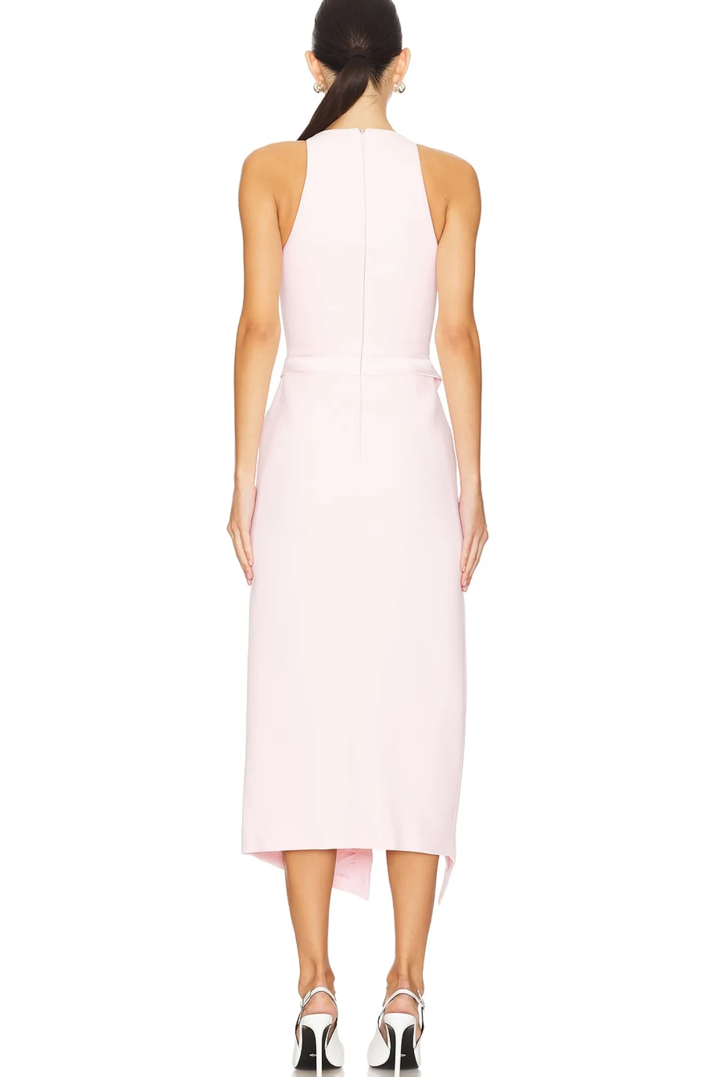 Self 1: 50% viscose 47% acetate 3% elastane Self 2: 78% triacetate 22% polyester Lining: 84% viscose 36% polyester.Made in United Kingdom.Dry clean only.Fully lined.Hidden back zipper closure.Bow detail at waist.Crepe fabric with front slit