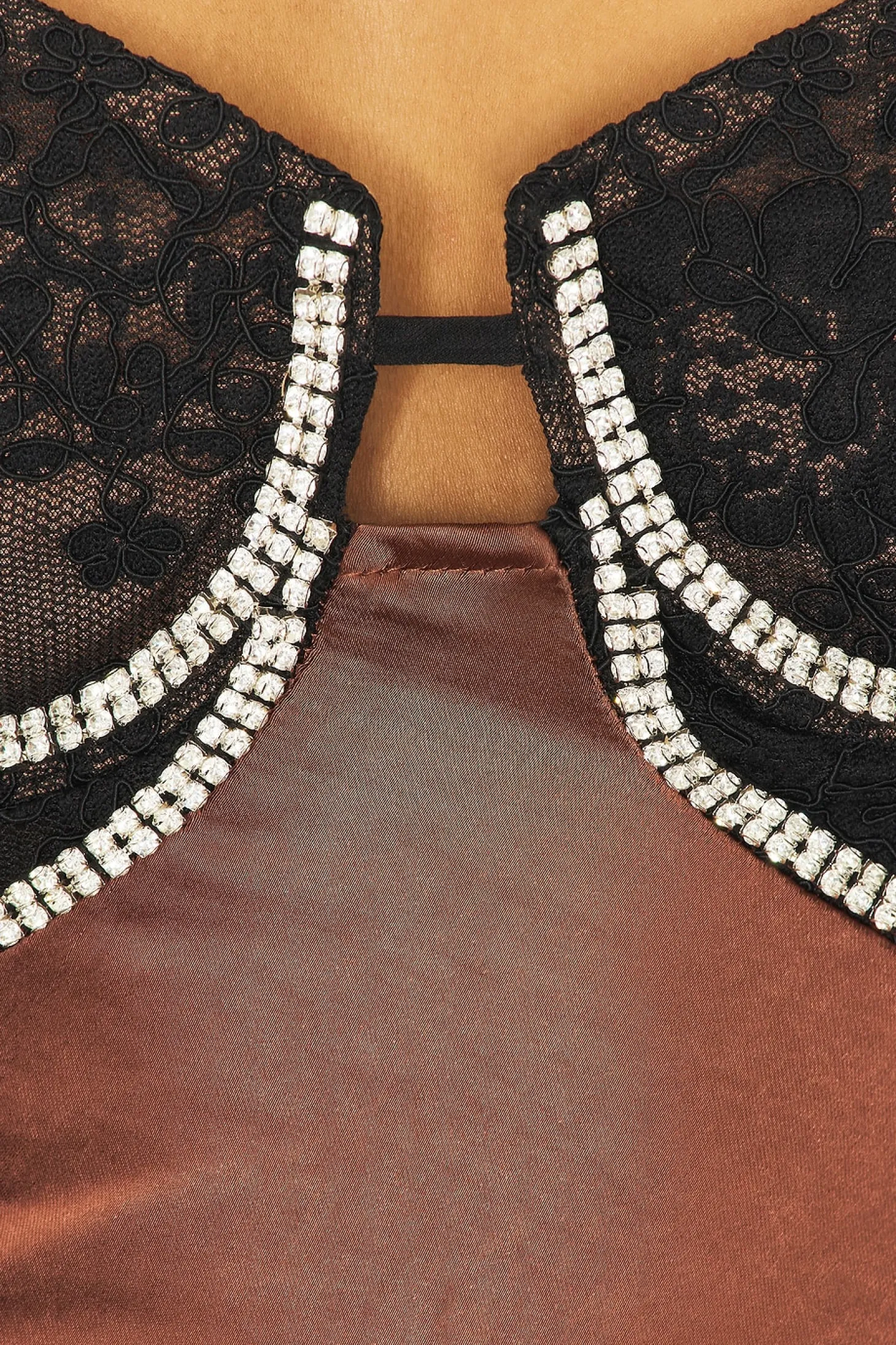 Self & Lining 1: 100% polyester Contrast Fabric: 68% polyester 17% cotton 15% viscose Lining 2: 100% polyamide.Made in China.Dry clean only.Unlined.Hidden side zipper closure.Crystal embellished trim Lace fabric at bust.Lightweight satin fabric