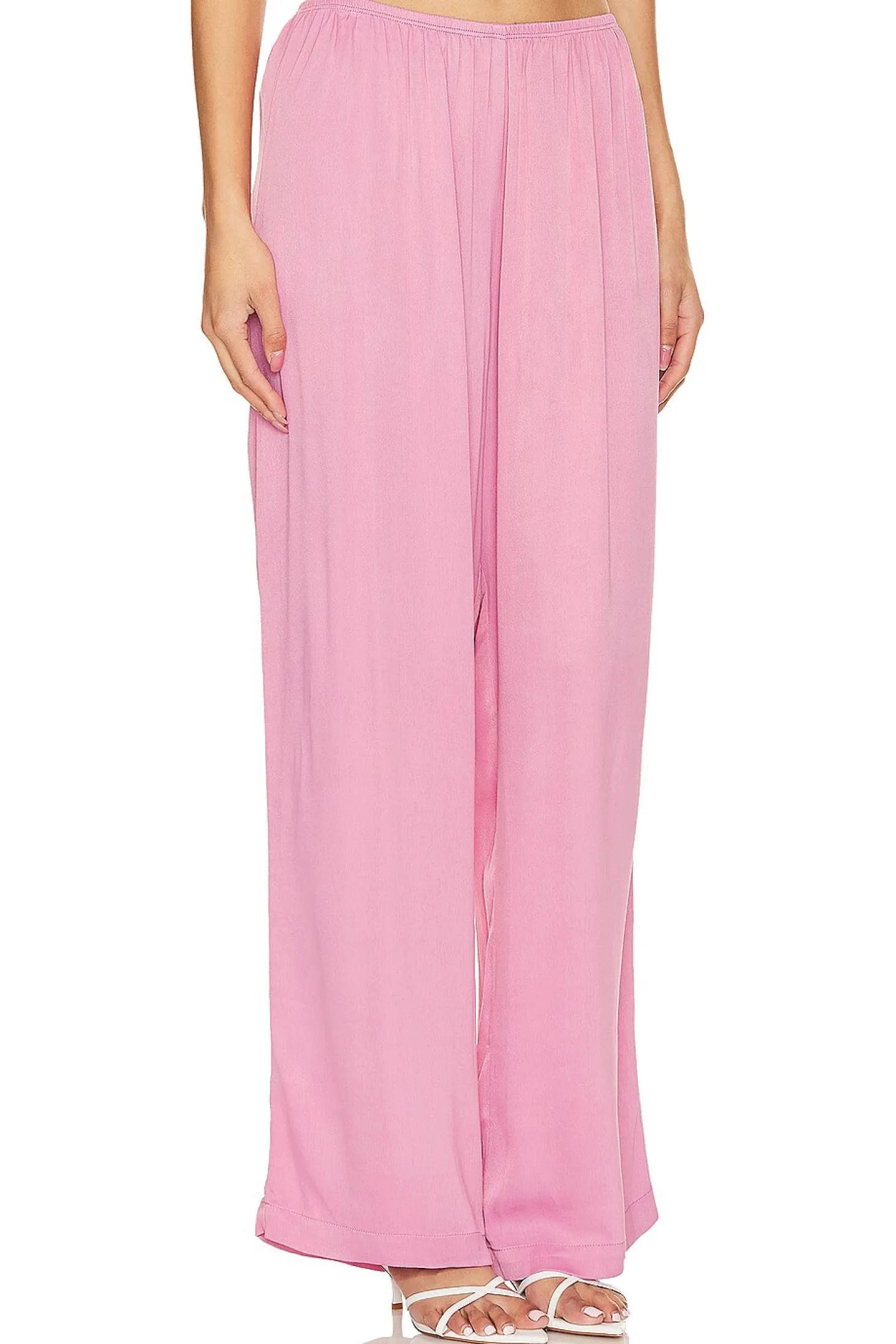 56% viscose 44% rayon.Made in USA.Hand wash.Pull-on styling with elastic waistband.Midweight satin fabric.Item not sold as a set.22" at the knee and 22" at the leg opening