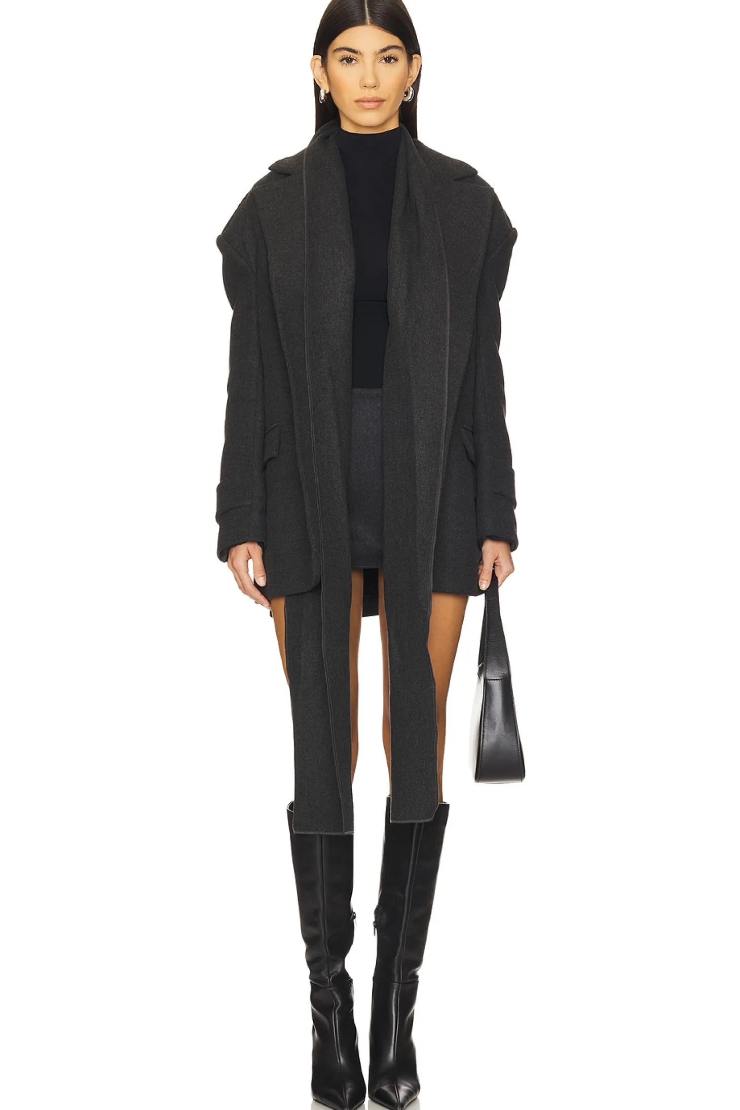 64% polyester 34% viscose 2% elastane.Made in Turkey.Machine wash.Open style with optional waist tie.Front flap pockets.Strap accent at cuffs.Includes scarf.Melton fabric with padded shoulders