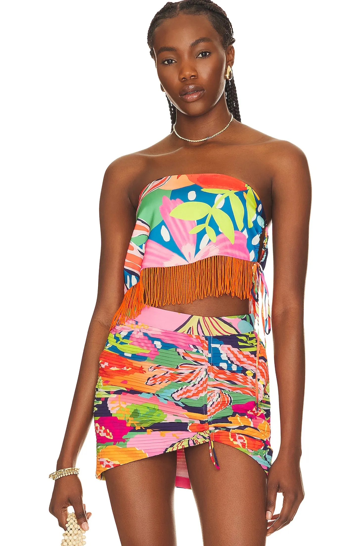 Self: 98% polyester 2% lycra Lining: 100% polyester.Made in India.Dry clean only.Side tie closure.Beaded fringe trim.Item not sold as a set