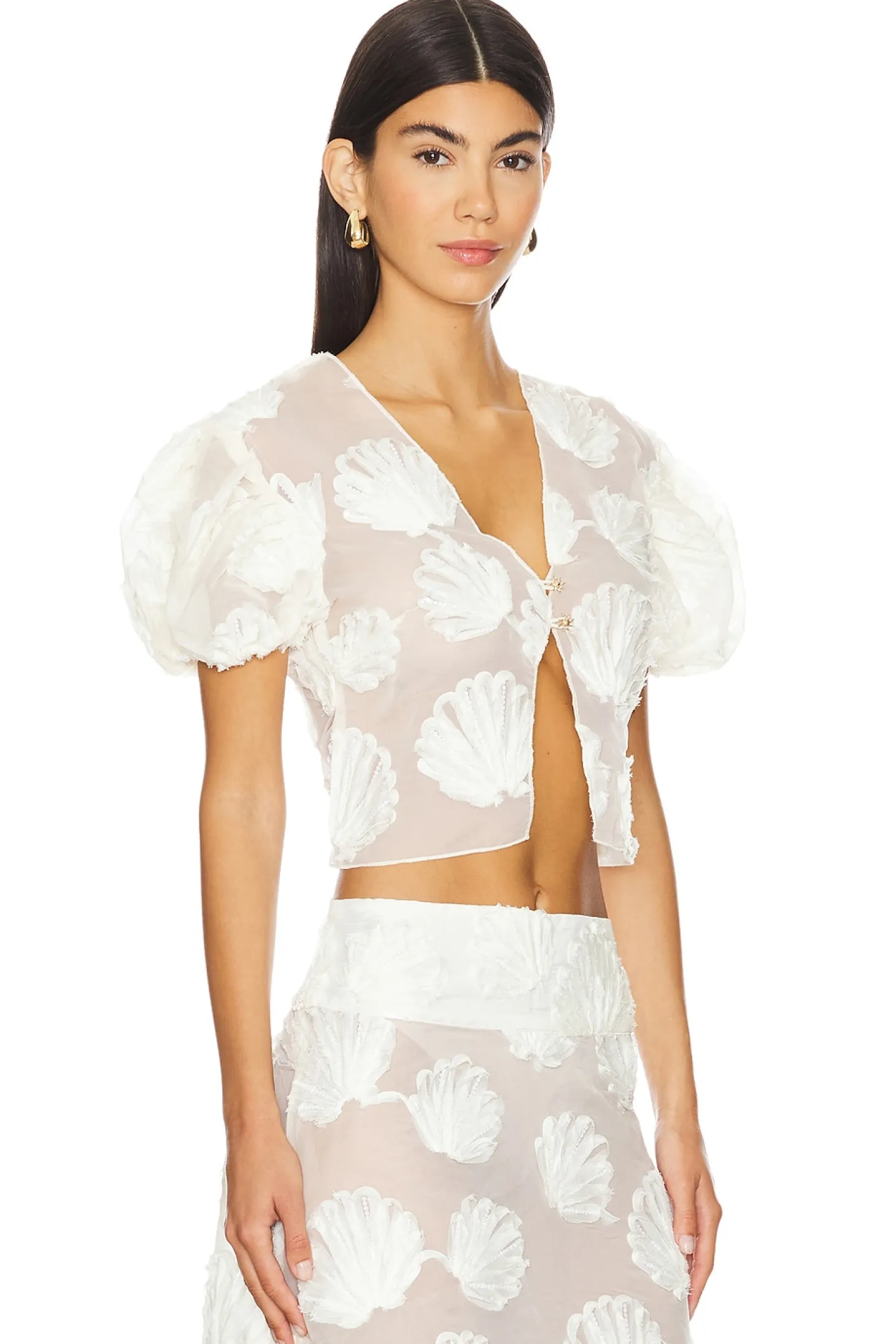 Organza textile.Imported.Dry clean recommended.Singular front button closure.Puff sleeves.Seashell pattern throughout.Lightweight fabric.Item not sold as a set