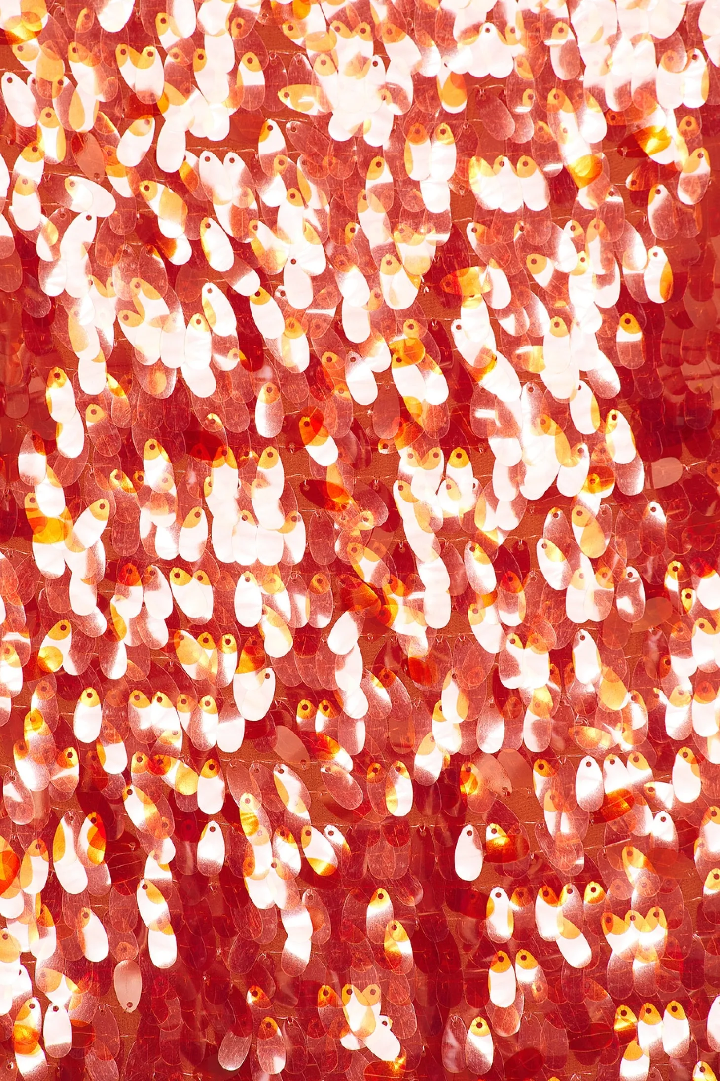 100% polyester.Made in China.Spot clean only.Fully lined.Hidden back zipper closure.Sequin embellished fabric with turtleneck styling
