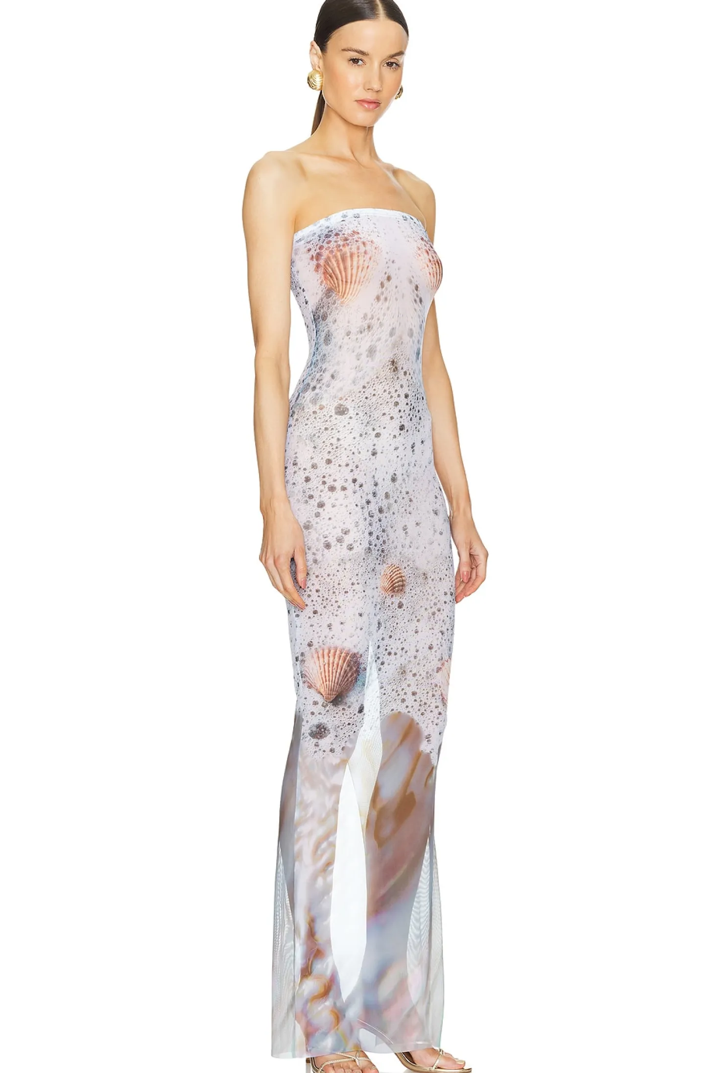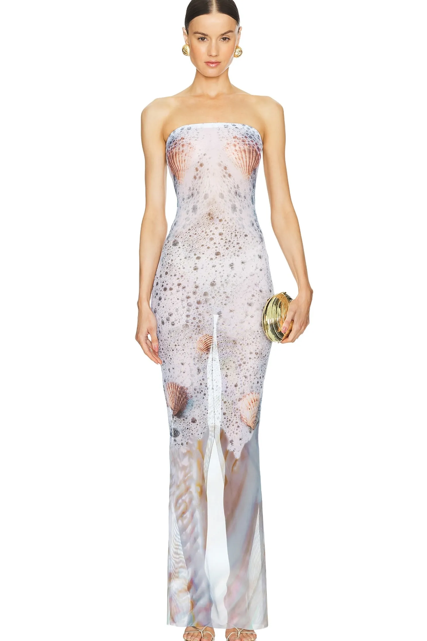 97% recycled polyester.Made in Greece.Hand wash.Unlined.Pull-on styling.Garment is intentionally sheer, undergarments will show through. Please note undergarment not included.Neckline to hem measures approx 57" in length