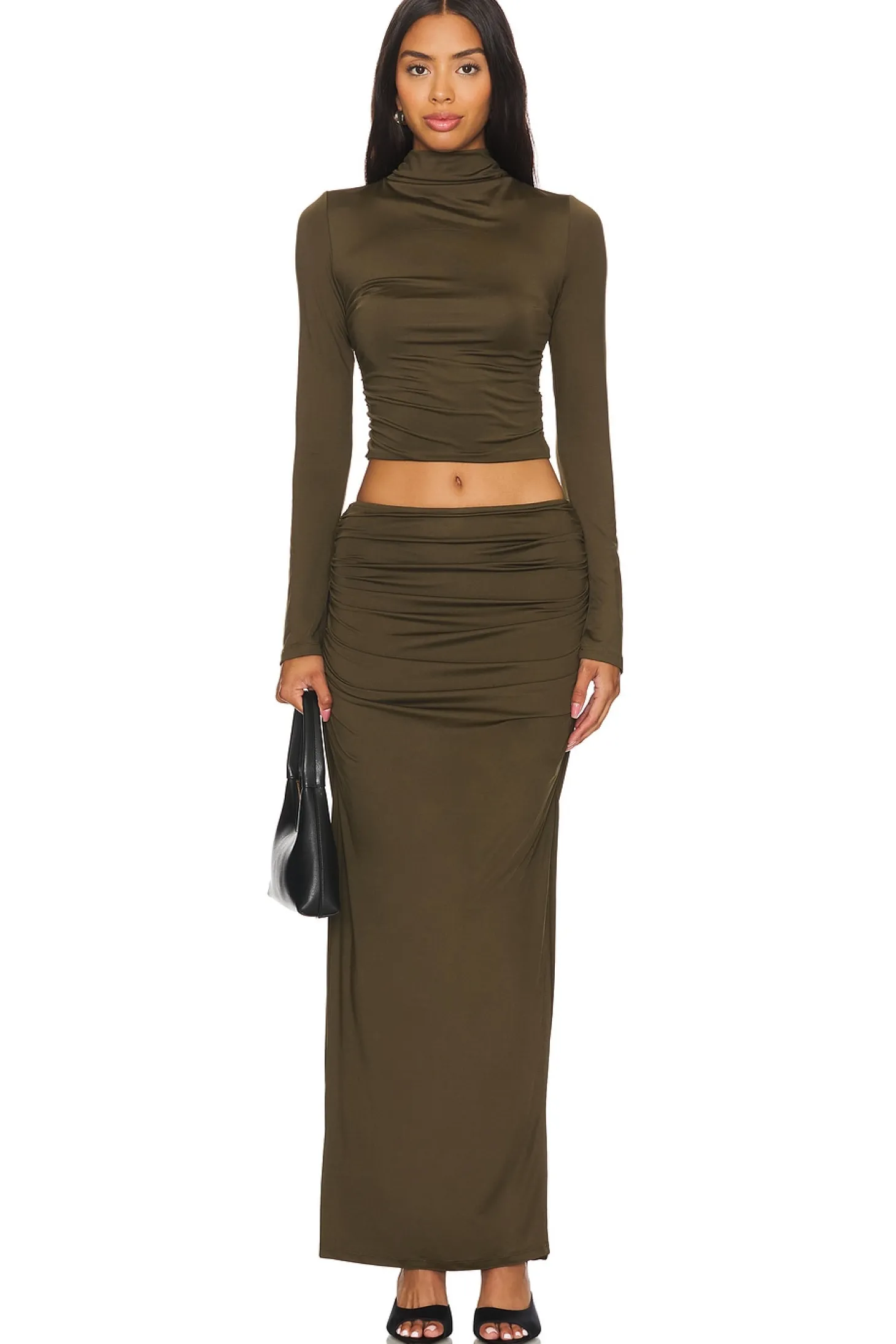 95% polyester 5% spandex.Made in China.Machine wash.Unlined.Pull-on styling with elastic waistband.Ruched jersey fabric with side slit.Item not sold as set.Skirt measures approx 40" in length