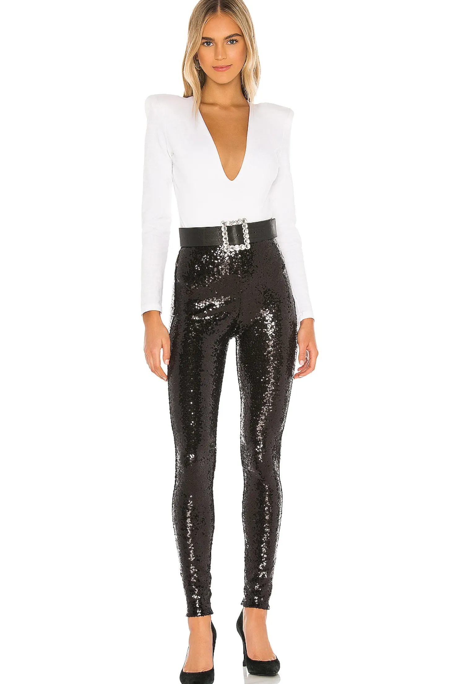 Self: 92% polyester 8% elastane Lining: 93% nylon 7%elastane.Made in Bosnia.Hand wash.All over sequin embellishment.12" at the knee narrows to 8" at the leg opening