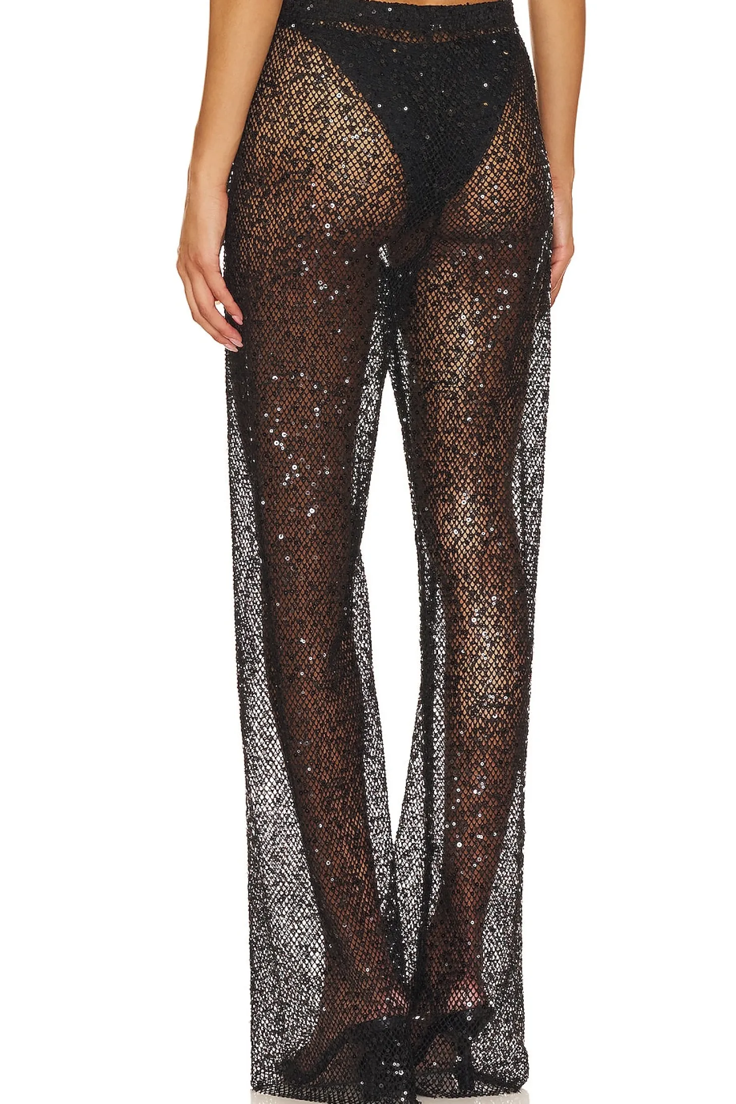 95% polyester 5% elastane.Made in China.Machine wash.Elastic drawstring waistband.Crochet knit fabric with tonal sequin embellishments.Garment is intentionally sheer, undergarments will show through. Please note undergarment not included Item not sold as a set.Model 1 is wearing size XS Model 2 is wearing size L.20" at the knee breaks to 22" at the leg opening