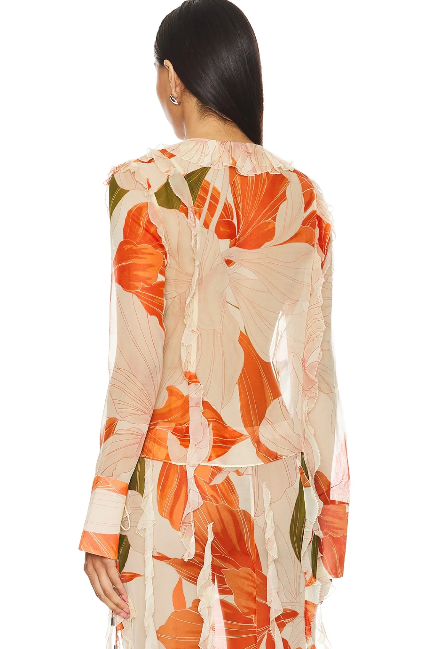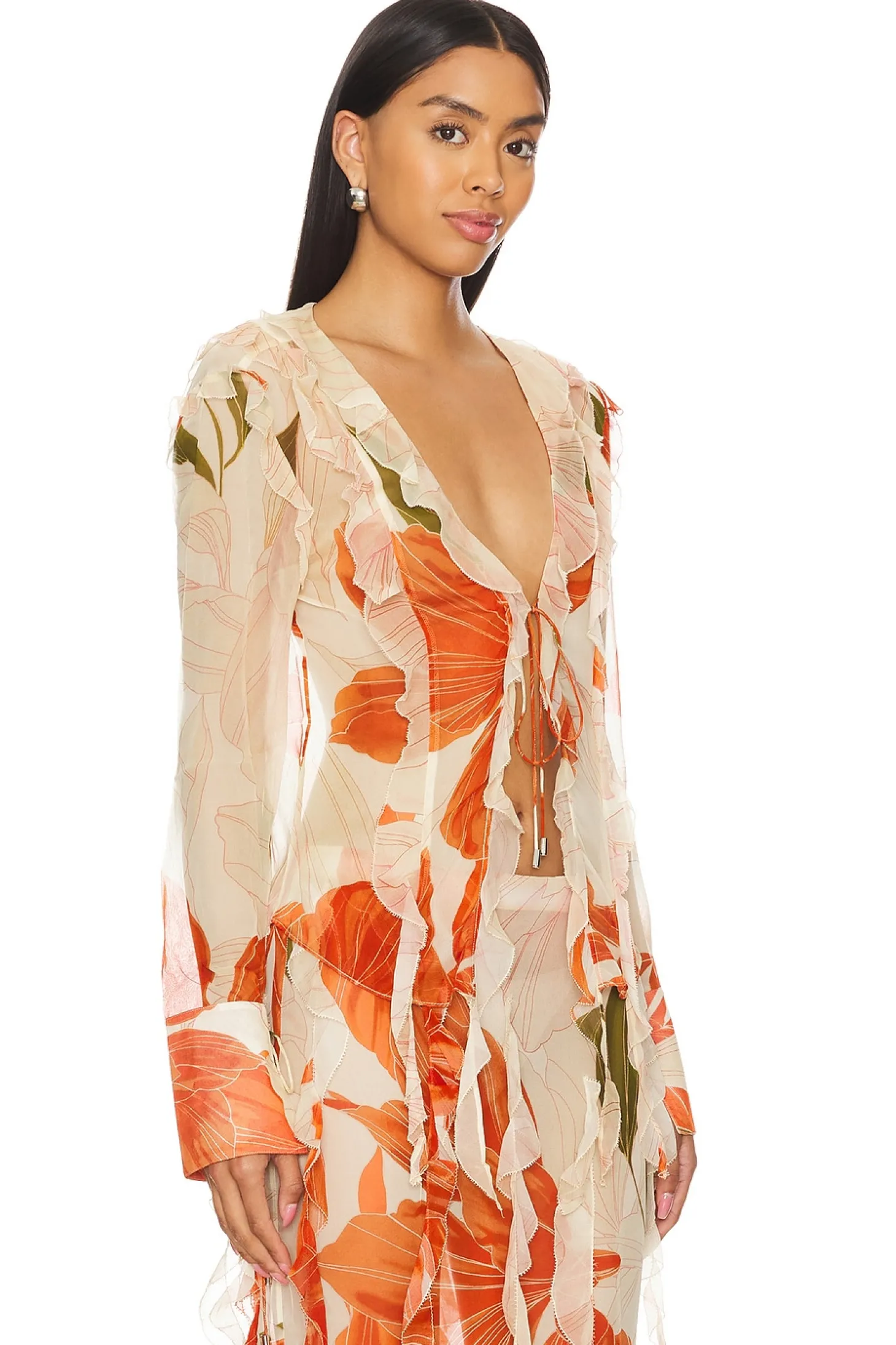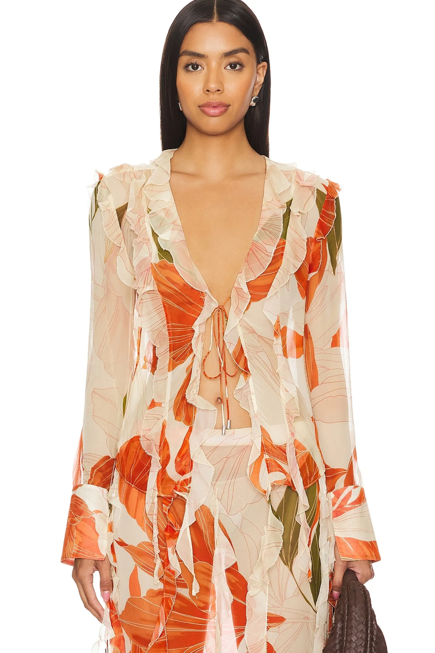 100% silk.Made in China.Dry clean only.Singular front tie detail.Tie detail at cuffs.Lightweight chiffon fabric with ruffle trim.Item not sold as a set