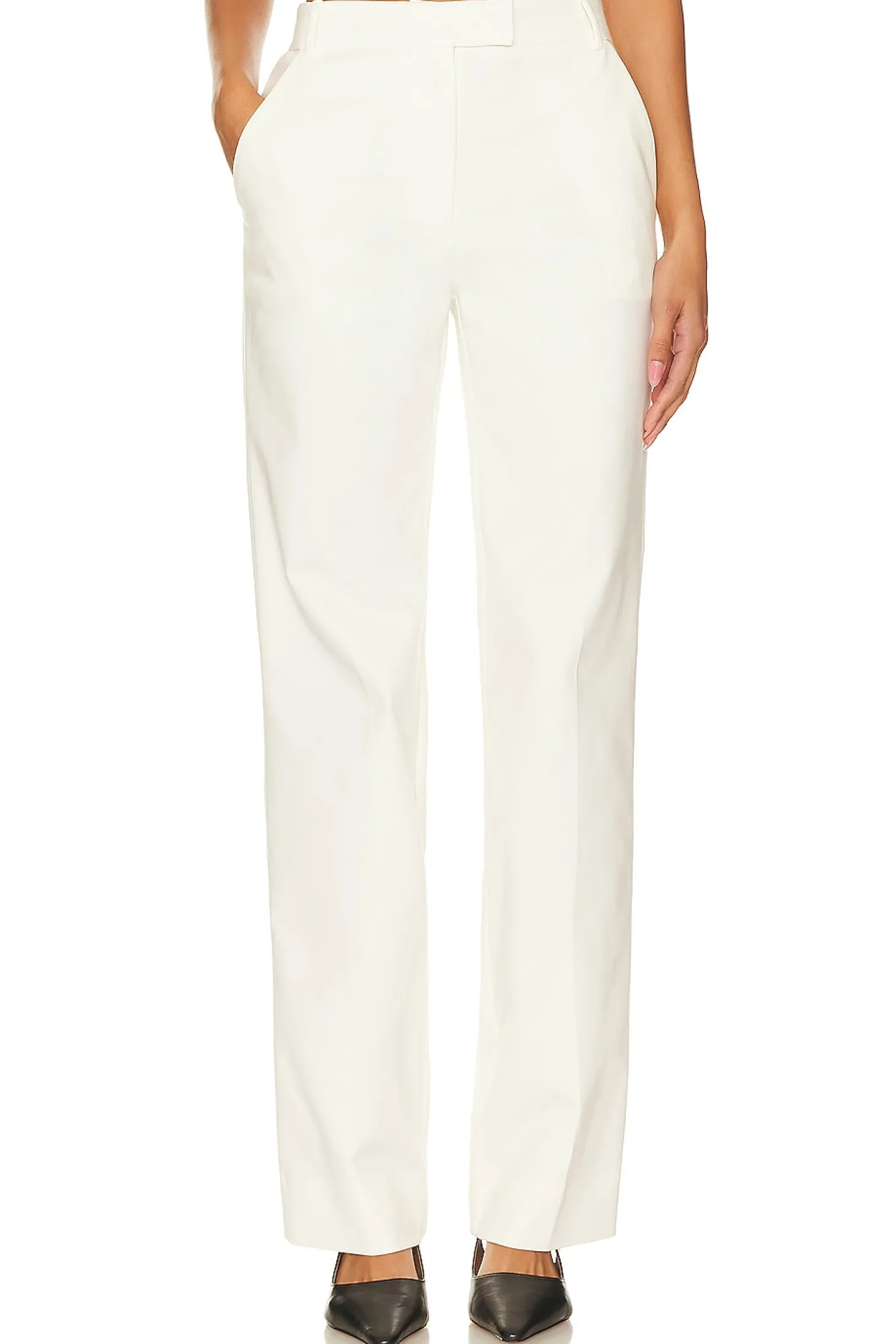 Blend beachy relaxation and elegance in The NBD Shahi Trouser in Ivory. Tailored with a high-waisted fit, its wide leg design provides a breezy feel, making it an ideal choice for both coastal getaways and sophisticated events. This ivory trouser is where casual meets class..Self: 69% cotton 29% nylon 3% spandex Lining: 97% polyester 3% spandex.Made in China.Hand wash.Zip fly with hook and bar closure.Side slant pockets and back faux welt pockets.Twill fabric Item not sold as set.17.5" at the knee breaks to 18" at the leg opening
