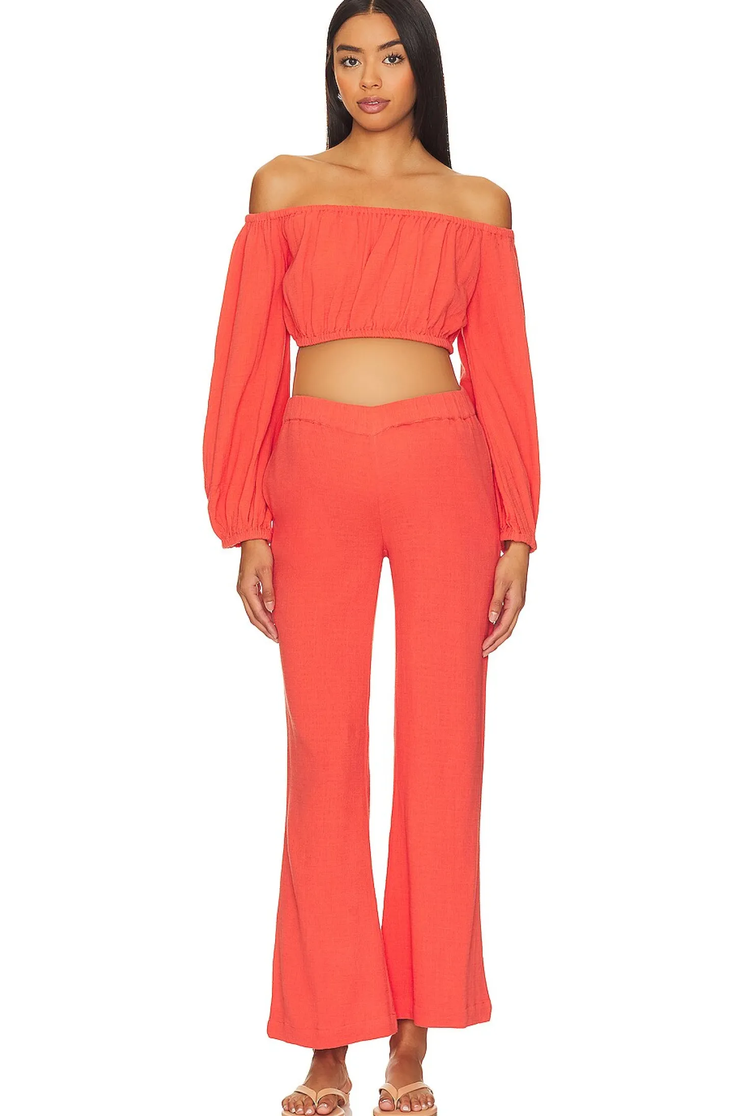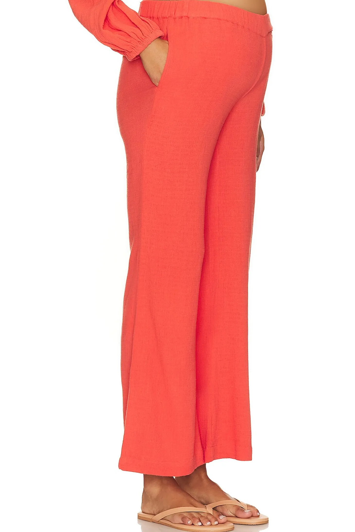100% cotton.Made in India.Machine wash.Elastic waist.Side slant pockets.Lightweight gauze fabric.Item not sold as a set.18" at the knee breaks to 22" at the leg opening