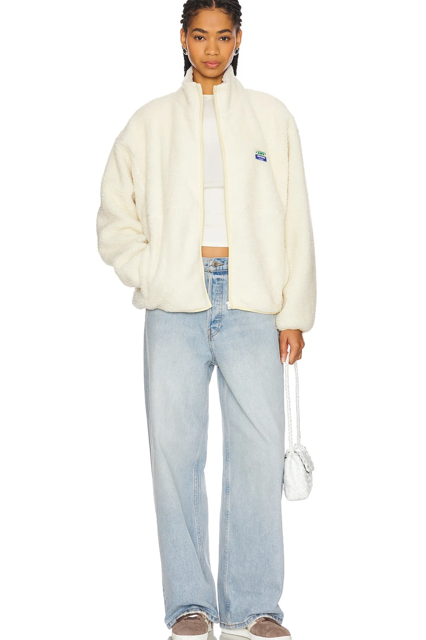 100% polyester.Made in China.Machine wash.Hidden front zipper closure.Side zip pockets.Lightweight sherpa