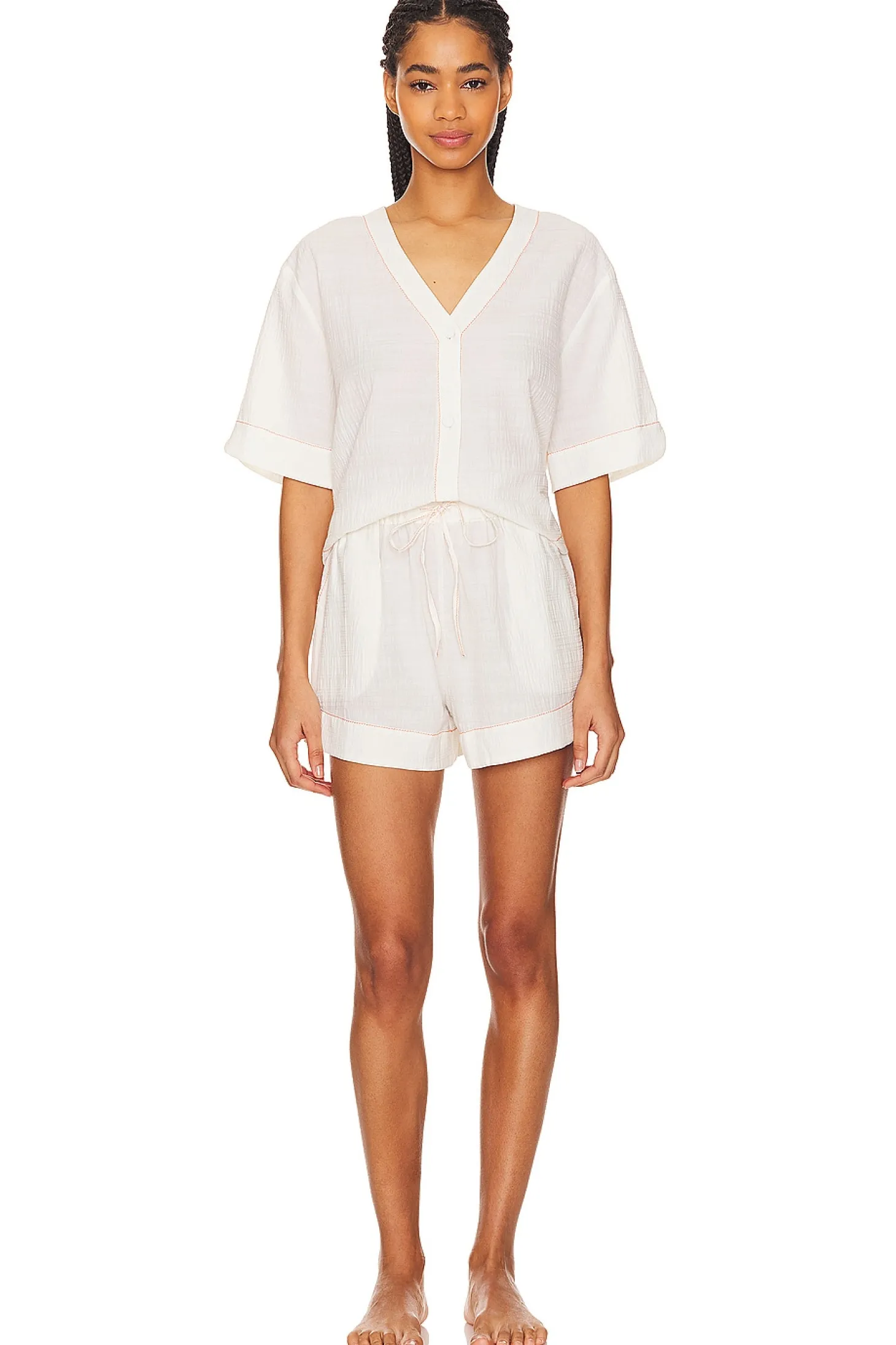 60% cotton 30% recycled polyester 10% linen.Made in China.Machine wash.Front button closure.Front button closure.Elastic waistband.Lightweight crepe fabric.Sold as a set