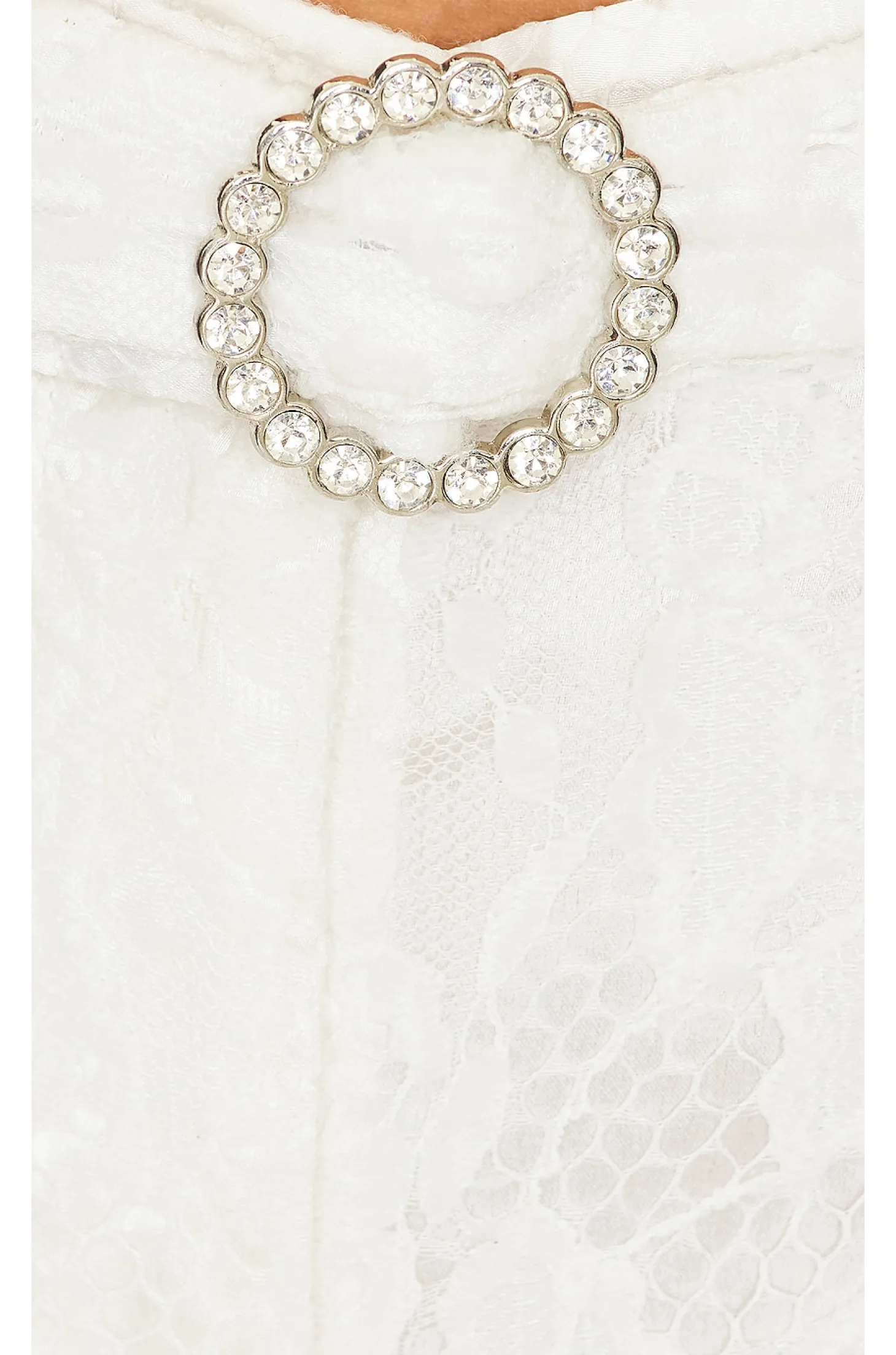Self: 100% nylon Lining: 100% polyester.Made in India.Dry clean only.Zip fly with hook and bar closure.4-pocket styling.Detachable waist belt with crystal embellished ring.Lace fabric Item not sold as a set.Shorts measure approx 14" in length