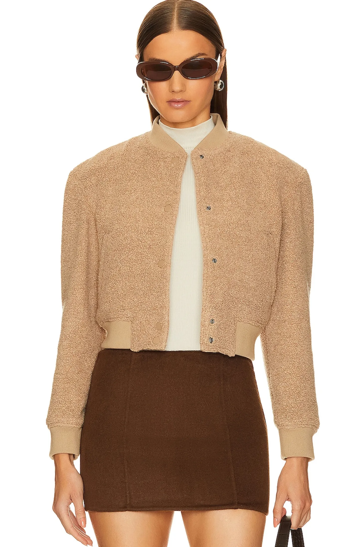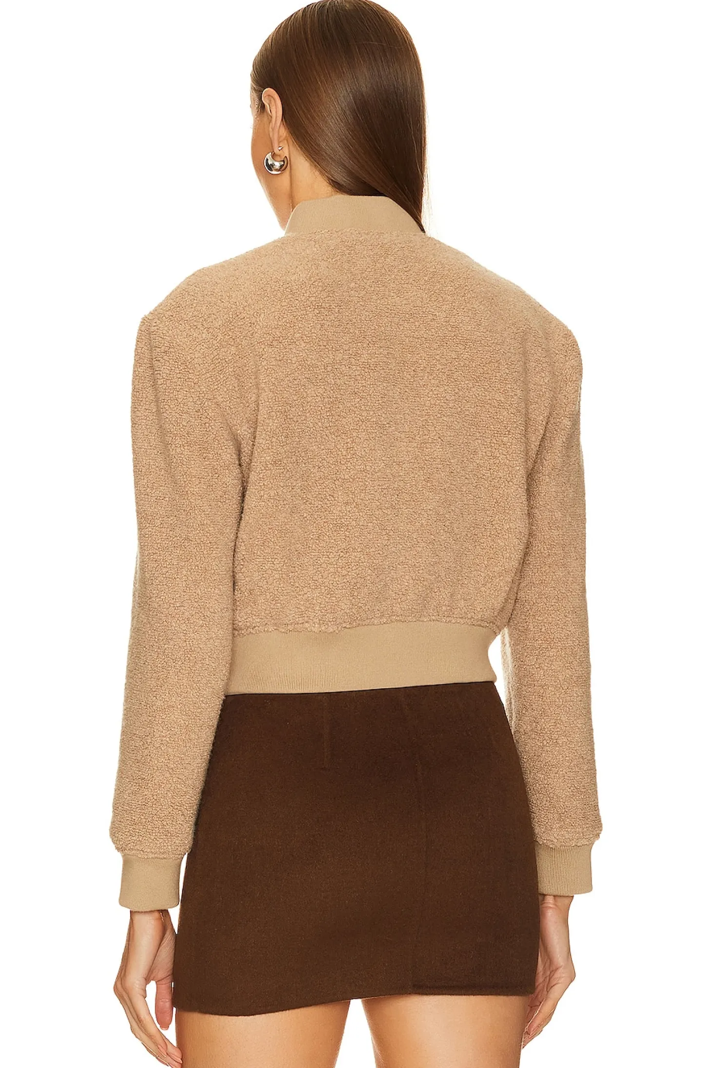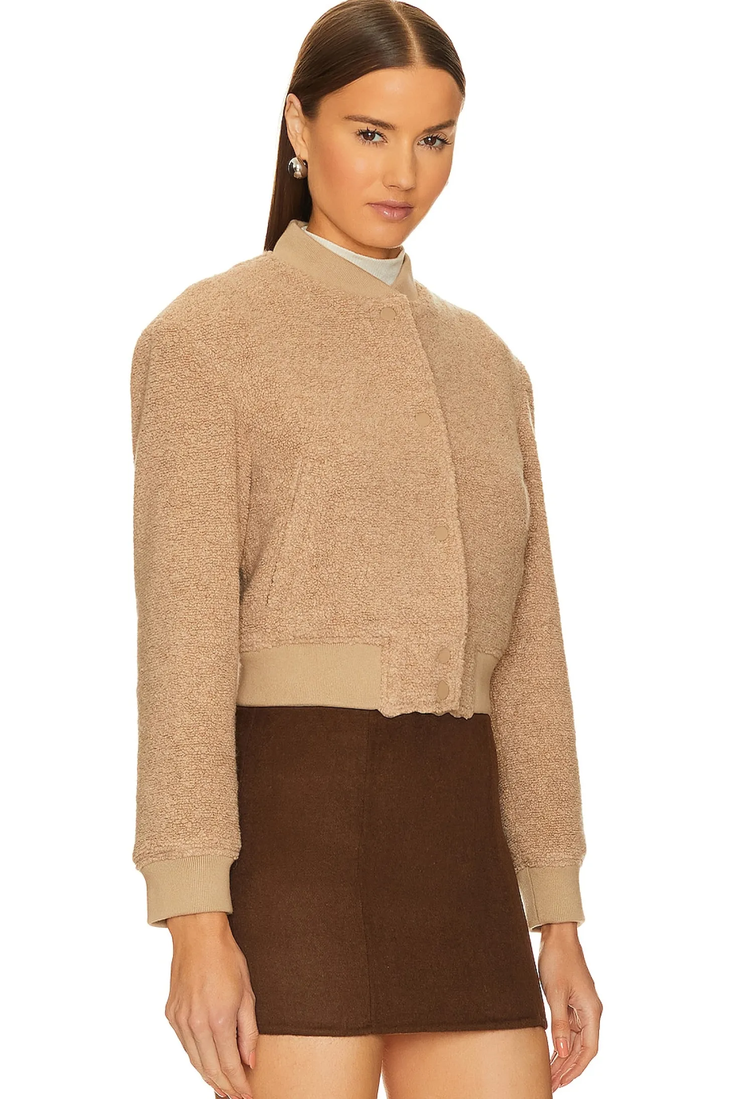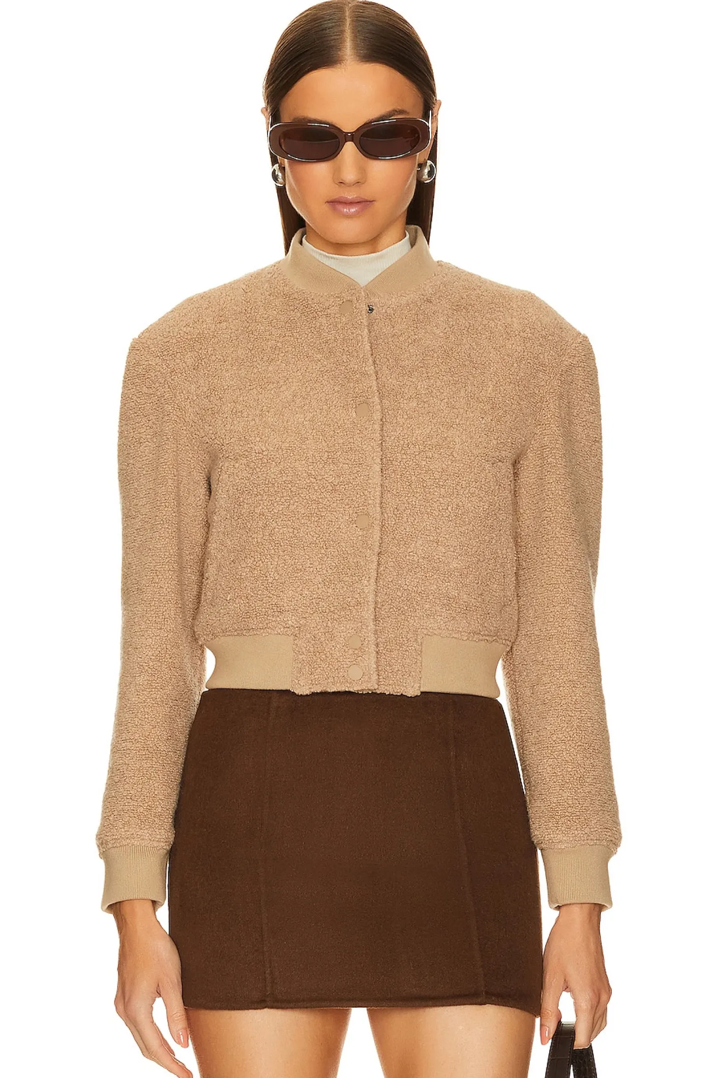 Self: 60% recycled wool 22% nylon 13% polyester 4% other fibers 1% elastane Lining: 100% polyester Contrast Fabric: 87% cotton 10% polyester 3% elastane.Made in Vietnam.Dry clean only.Front button closure.Side slant pockets.Faux fur teddy knit with ribbed knit cuffs and hem