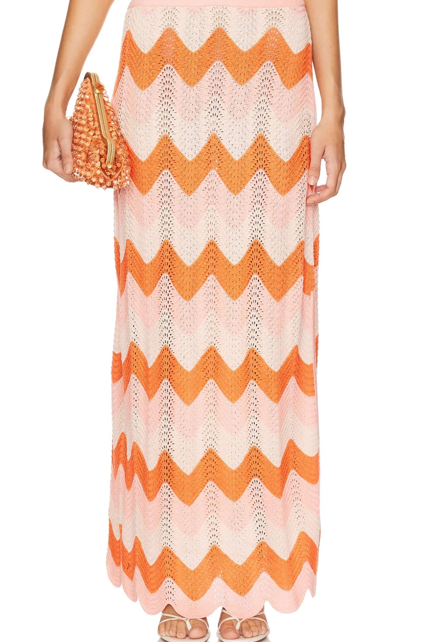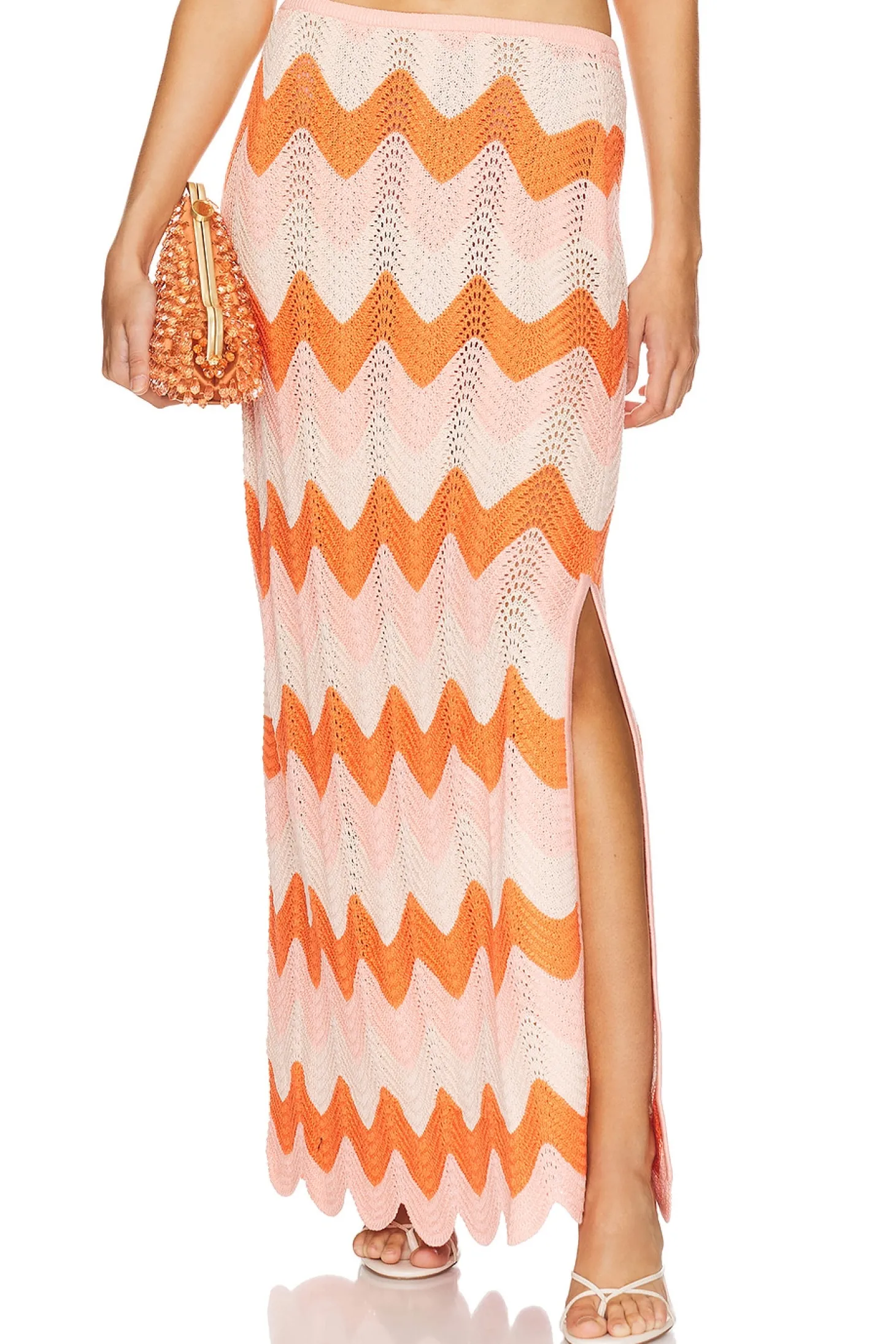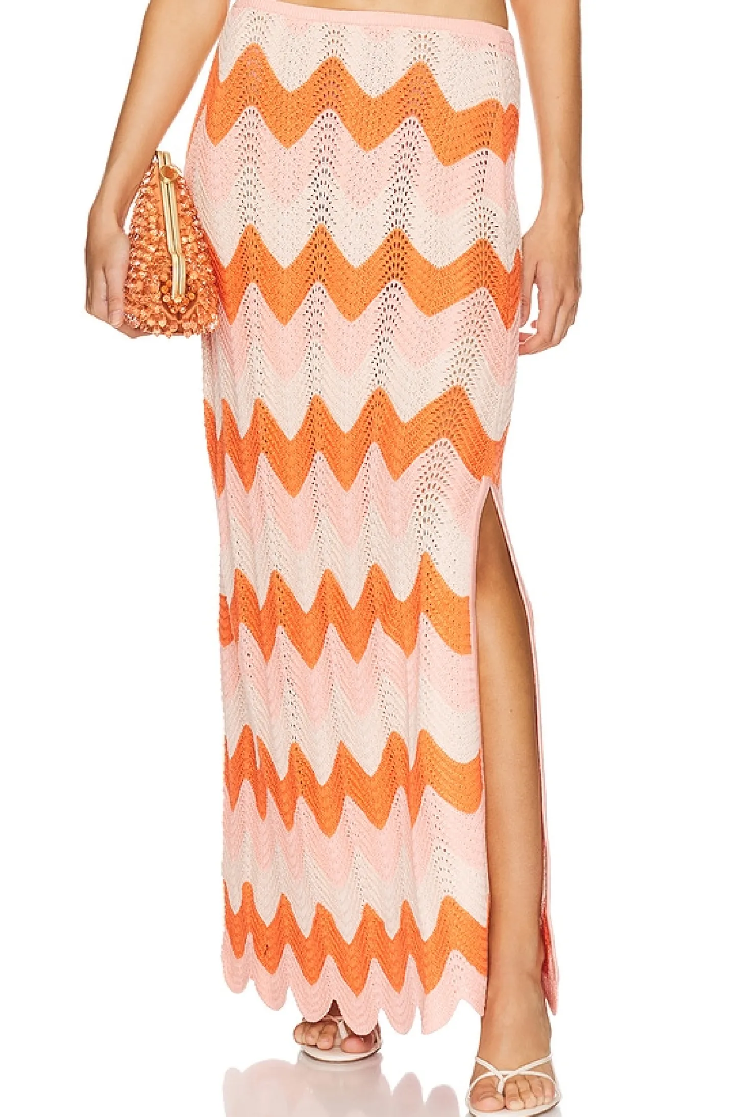89% acrylic 11%nylon.Made in China.Dry clean only.Unlined.Pull-on styling with elastic waistband.Side seam slit.Lightweight crochet fabric with scalloped hem.Skirt measures approx 41.5" in length