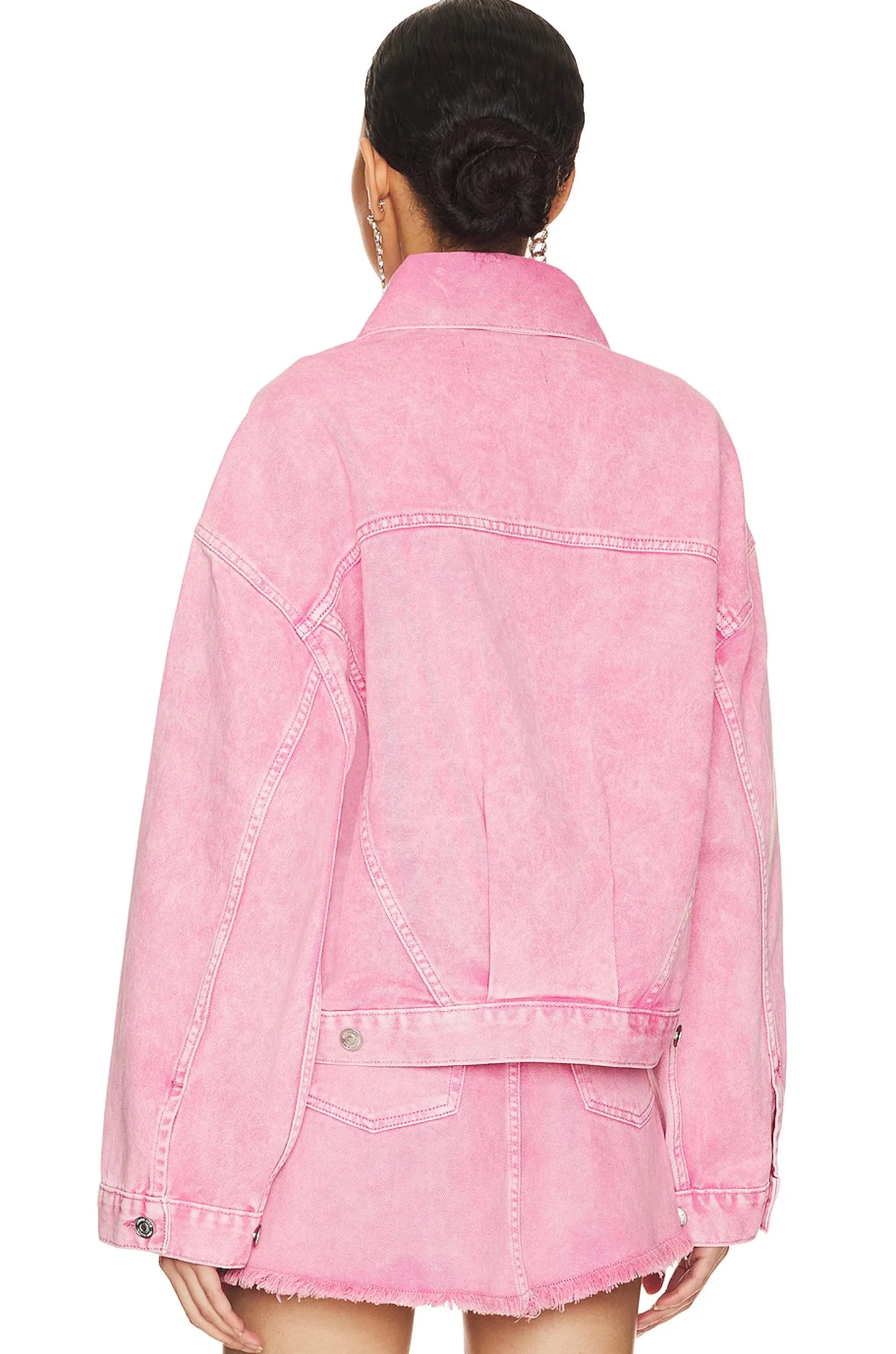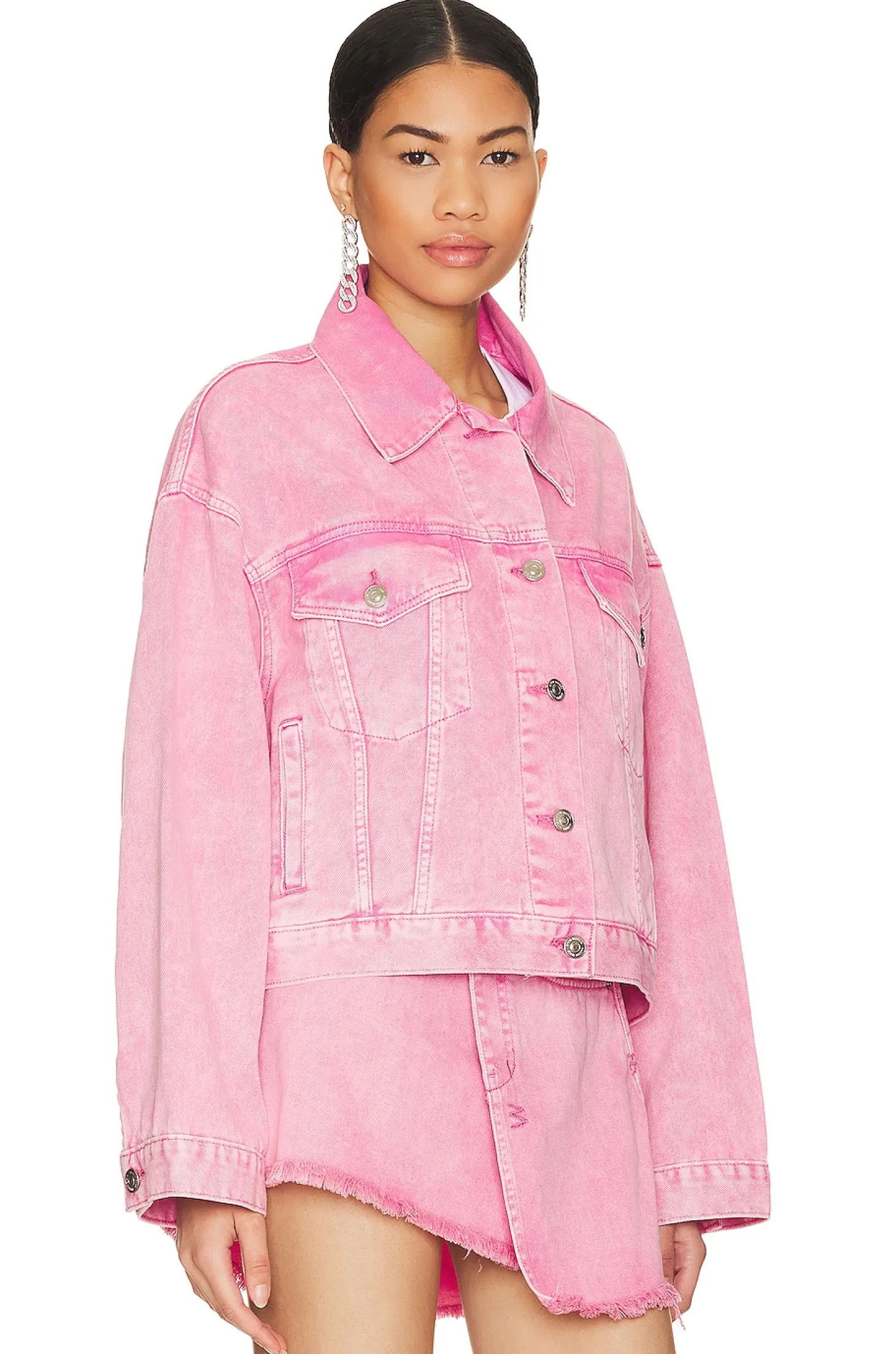 100% cotton.Made in China.Machine wash.Front button closure.Breast flap pockets with button closure Side slant pockets.Buttoned cuffs.Subtle faded wash.Item not sold as a set.Casual meets flirty. The Sienna Denim Jacket is an oversized denim trucker jacket with a waist length hem and front buttons for closure.