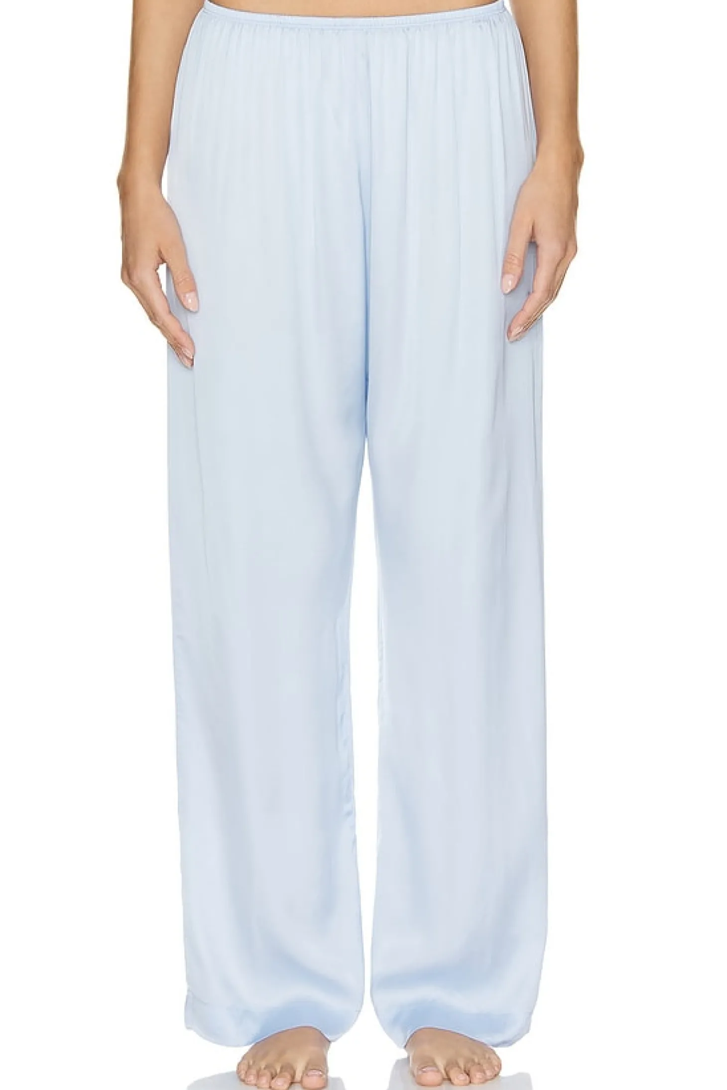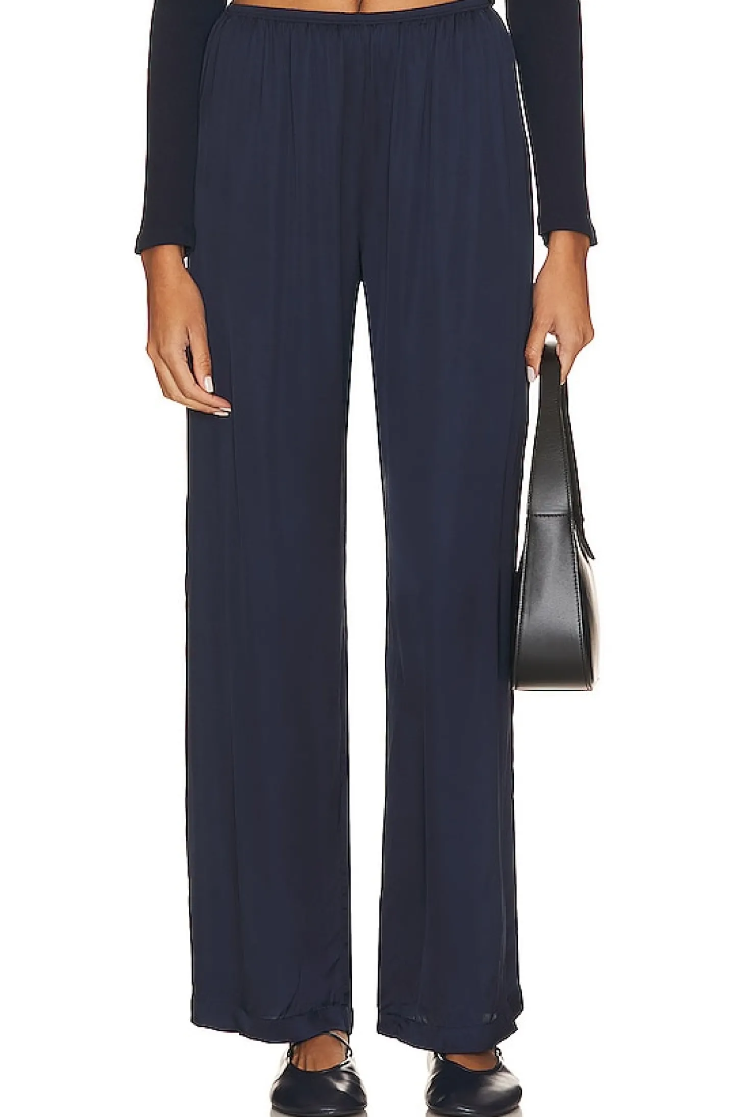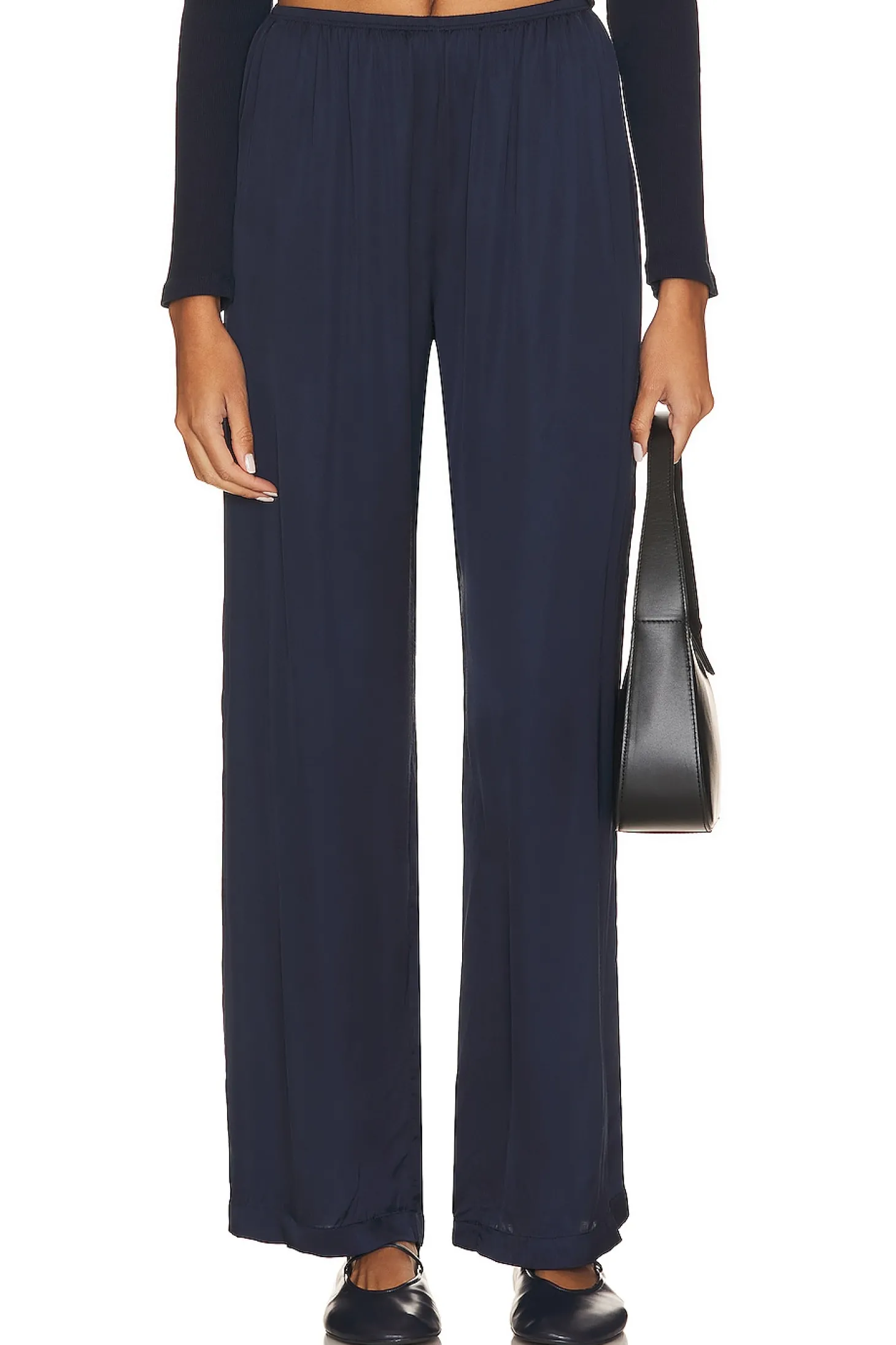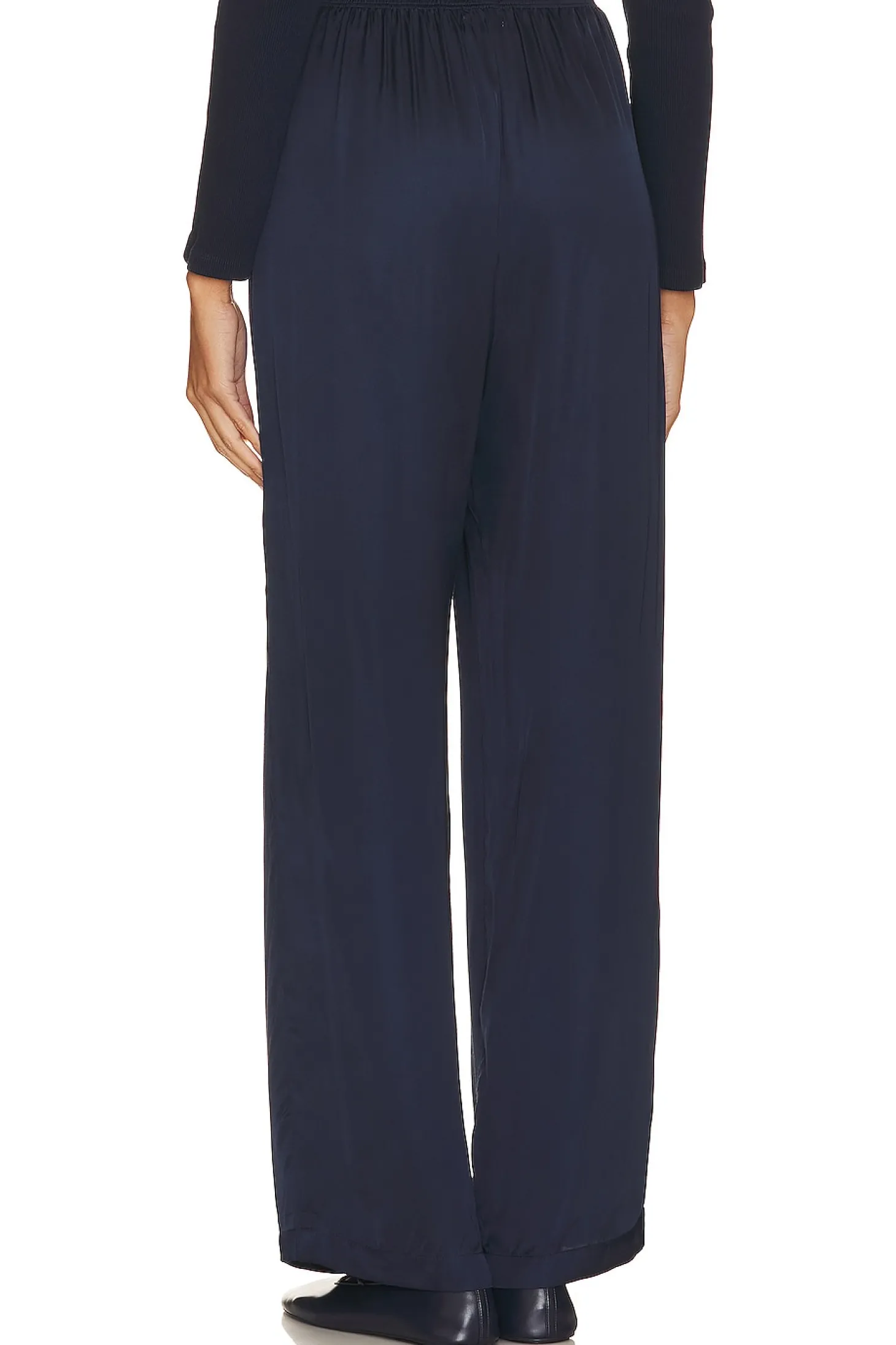100% viscose.Made in USA.Dry clean only.Elastic waistband.Lightweight sateen fabric.20" at the knee and 20" at the leg opening