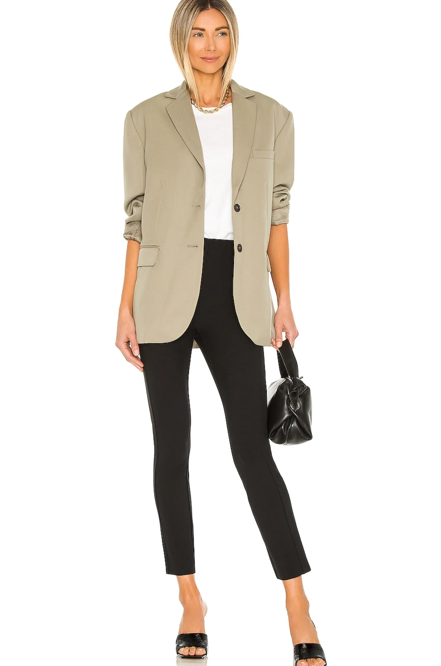66% cotton 27% polyamide 7% elastane.Made in USA.Dry clean only.Hidden back zipper closure.Elastic waistband.Mid-weight twill fabric.Flattering streamlined seaming.12" at the knee and 12" at the leg opening