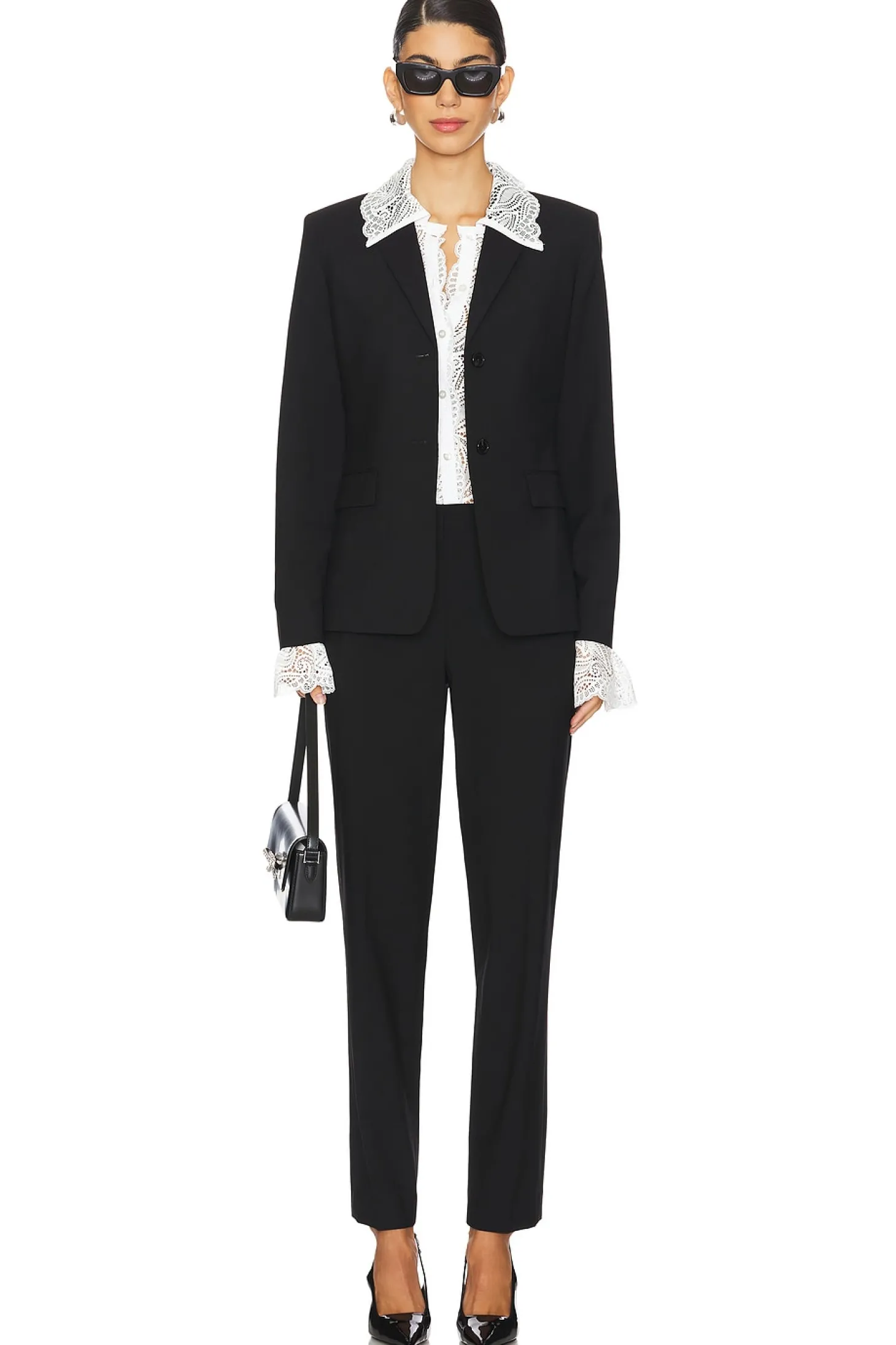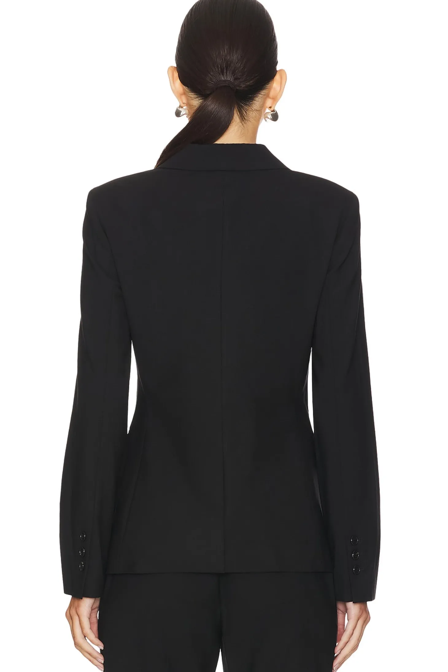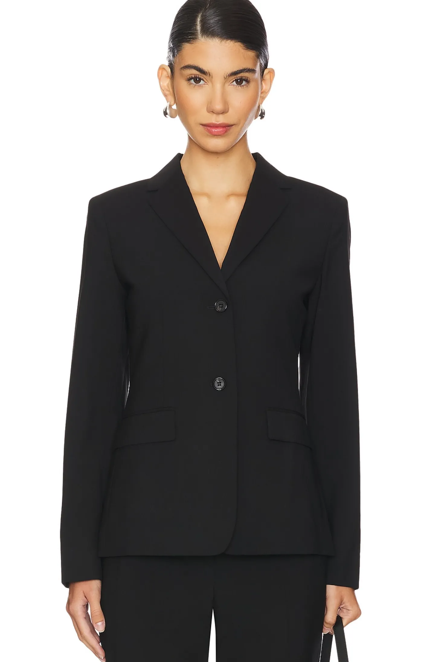 Self: 96% wool 4% elastane Lining: 100% cupro.Made in China.Dry clean only.Single breasted closure.Front flap pockets.Buttoned cuffs and padded shoulders.Traceable wool fabric.Item not sold as set