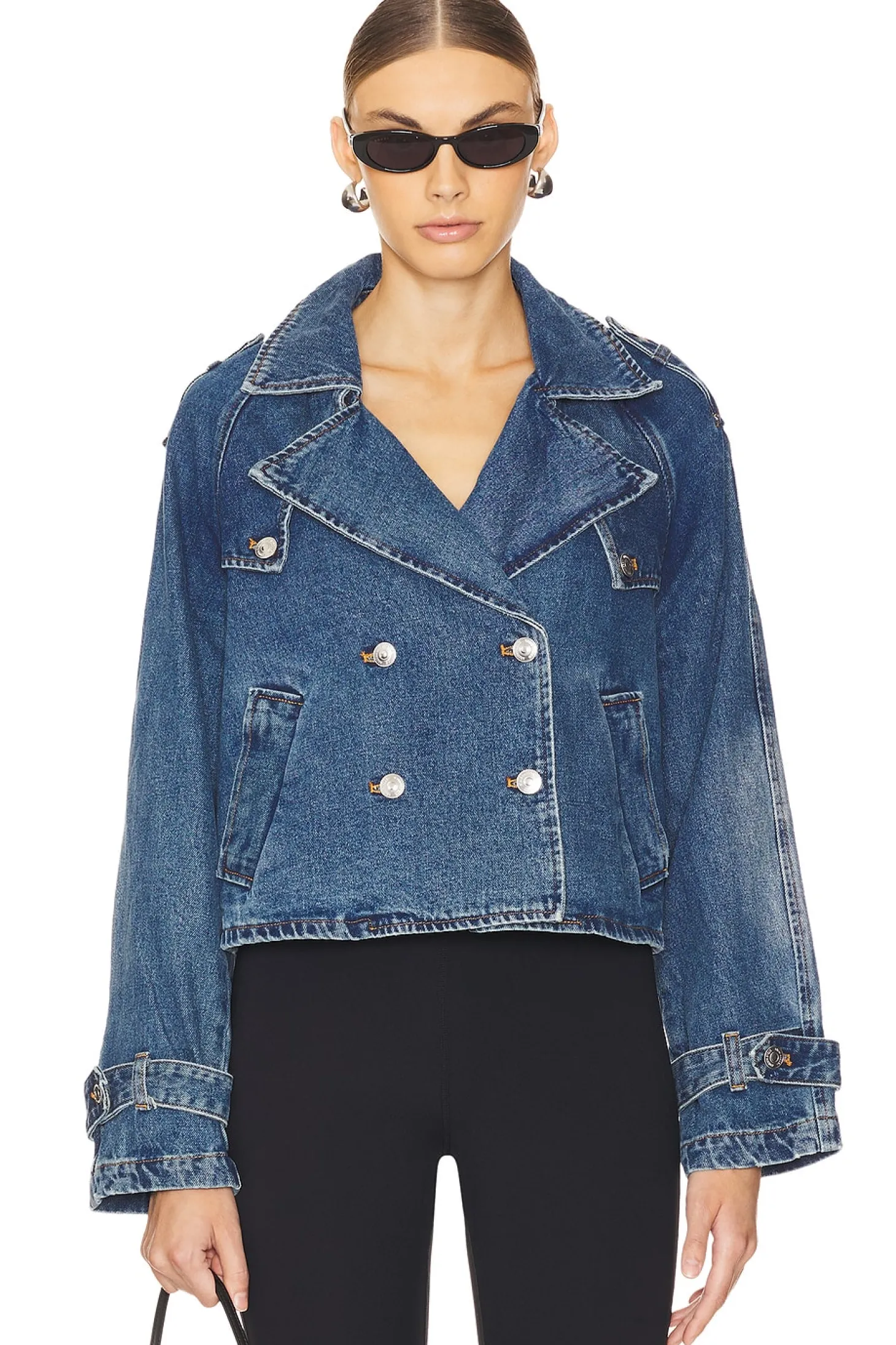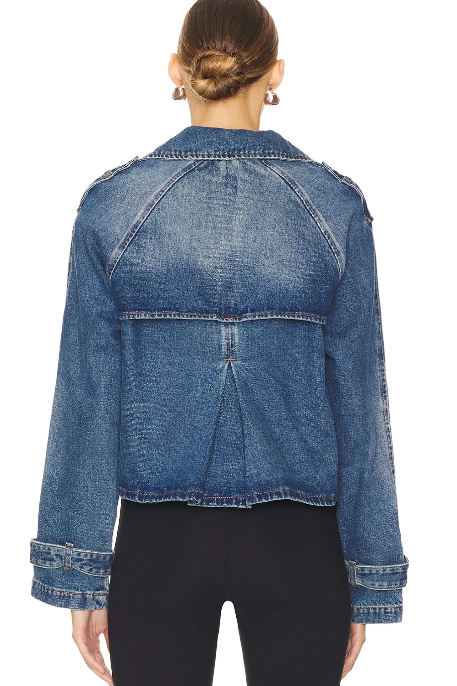 73% cotton 18% rayon 9% polyester.Made in China.Machine wash.Dual-breasted front button closure.Side slant pockets.Rigid denim with button tabs