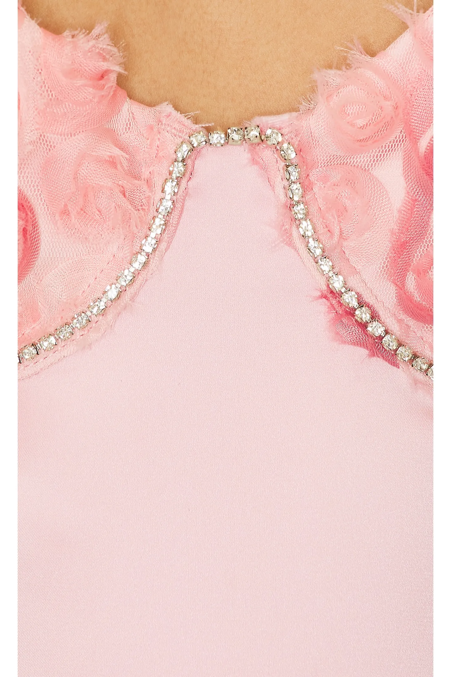 Self: 97% recycled polyester 3% spandex Contrast Fabric: 100% polyester.Made in China.Dry clean only.Gusset snap button closure.Unpadded underwire cups with rose appliqués.Crisscross adjustable back straps.Crystal embellished trims.Item not sold as a set