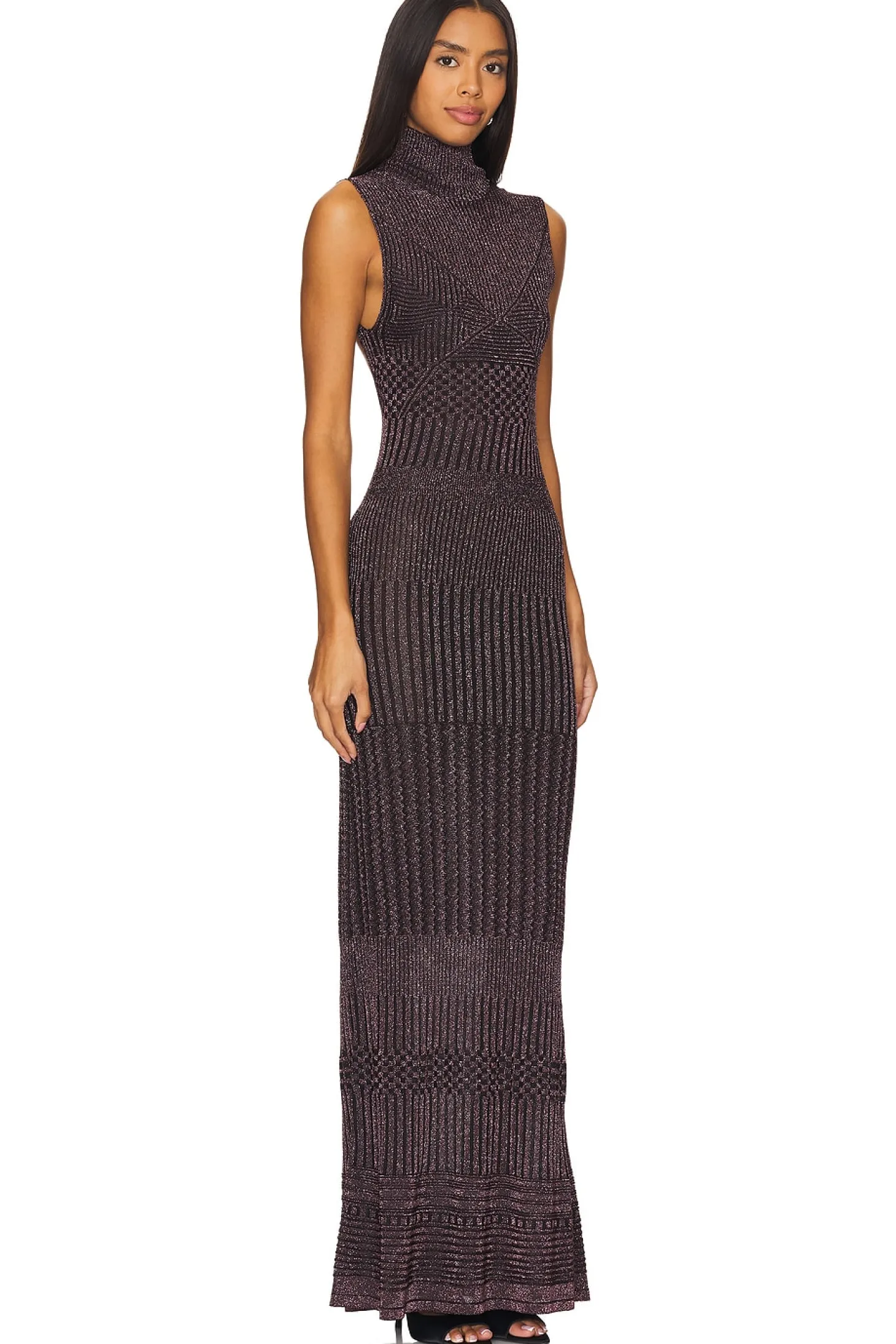 66% viscose 34% metallic fiber.Made in Italy.Hand wash.Unlined.Pull-on styling.Open back design.Slinky knit fabric with metallic threading