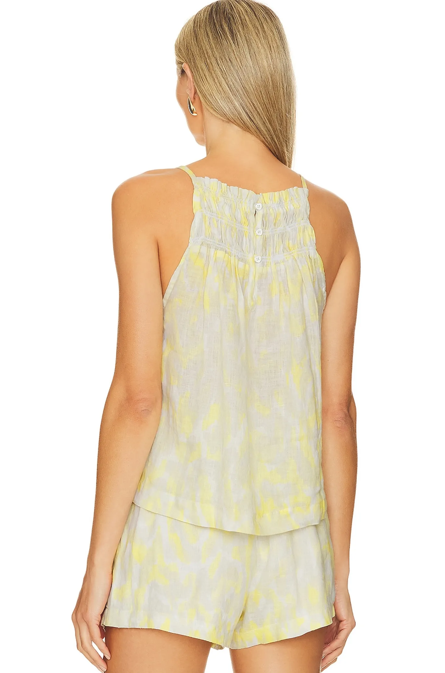 100% linen.Made in USA.Machine wash.Back loop button closure.Smocked neckline.Lightweight linen fabric.Item not sold as a set