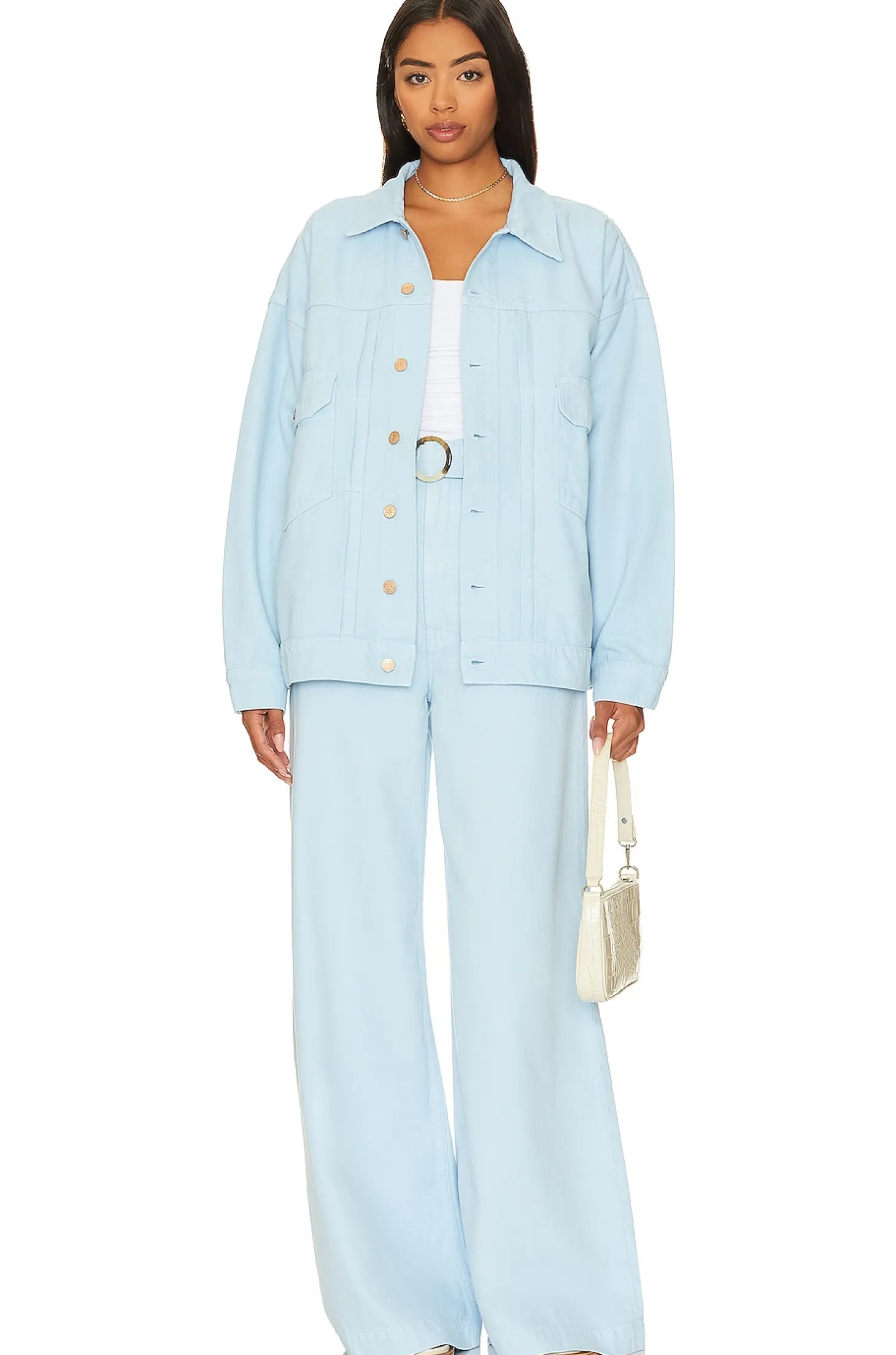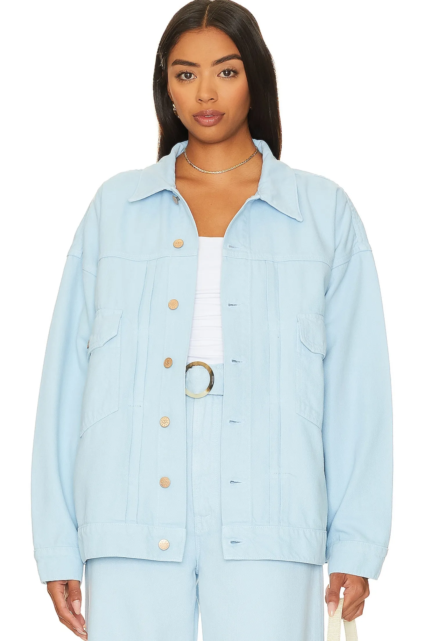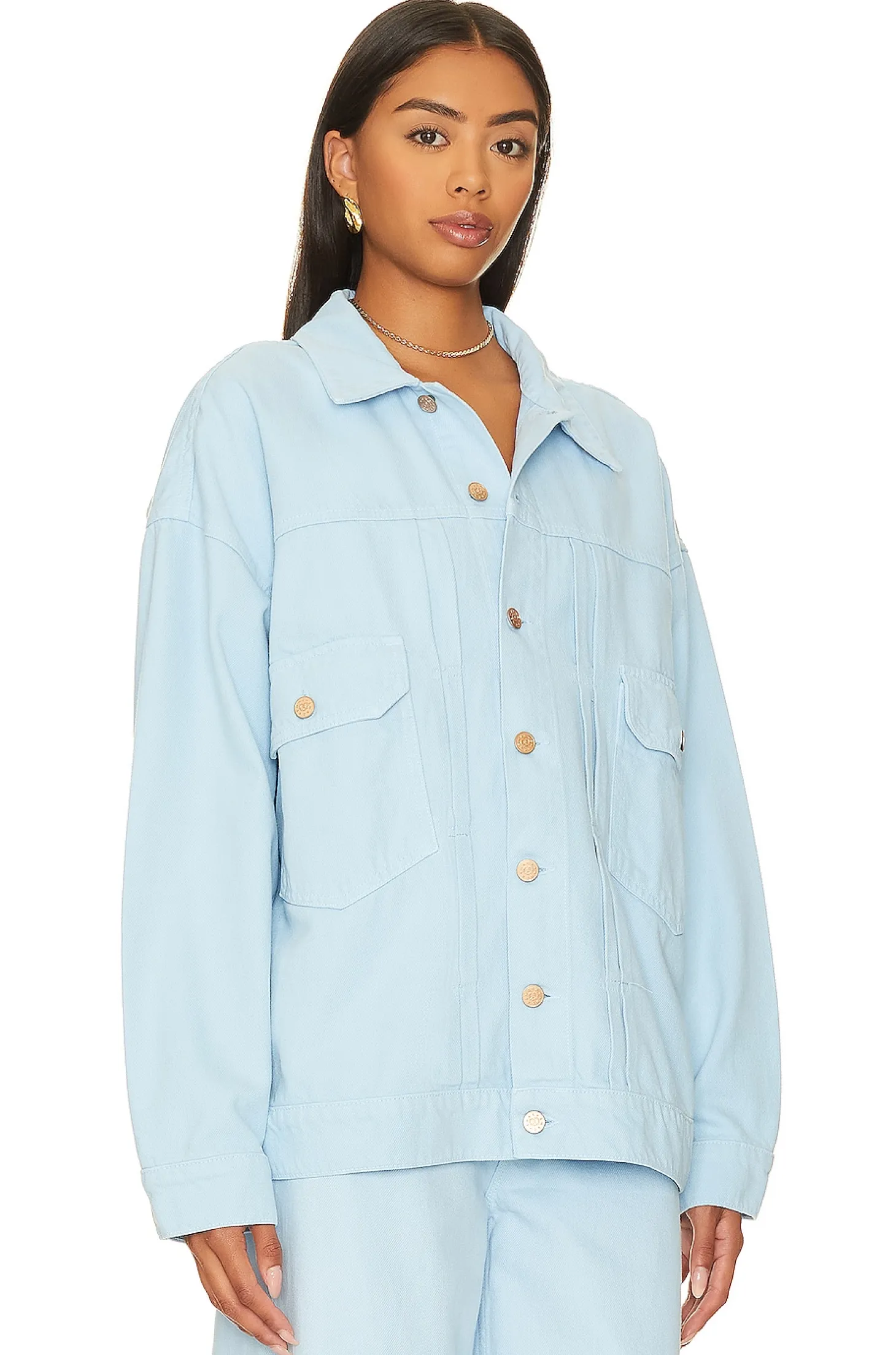 60% cotton 40% lyocell.Made in USA.Machine wash.Front button closure.Breast flap pocket with button closure.Banded buttoned cuffs.Structured denim fabric.Item not sold as a set