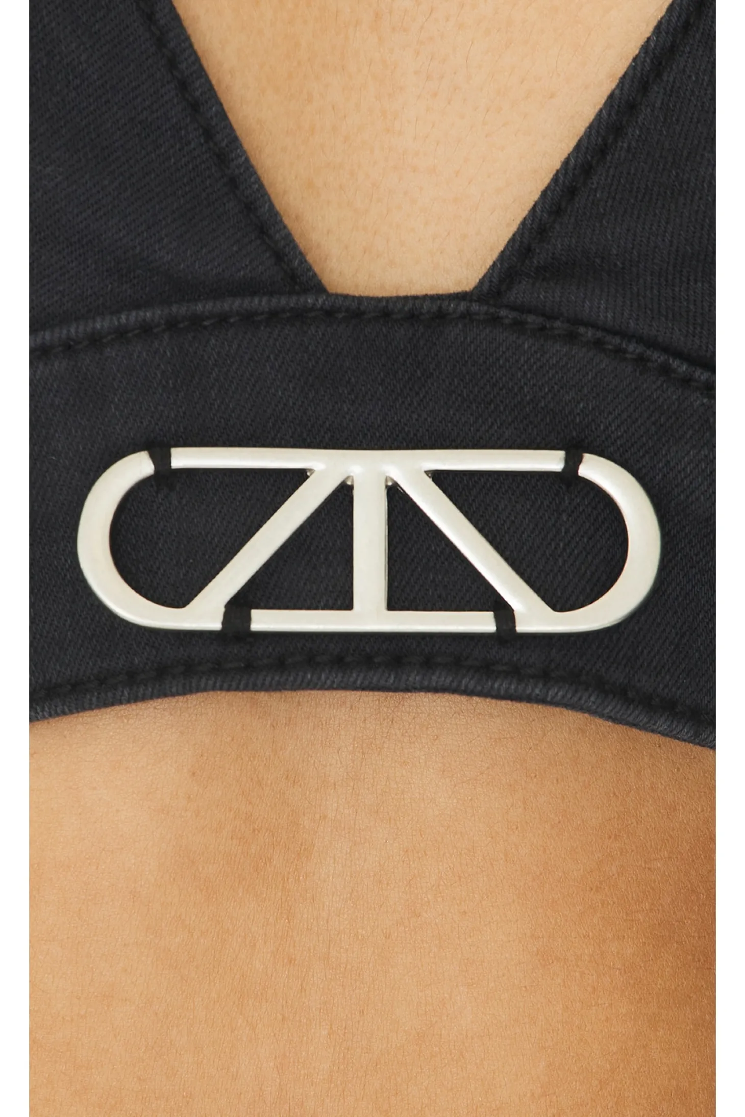 93% cotton 6% polyester 1% lycra.Made in China.Machine wash.Unpadded.Back snap button closure.Adjustable shoulder strap styling