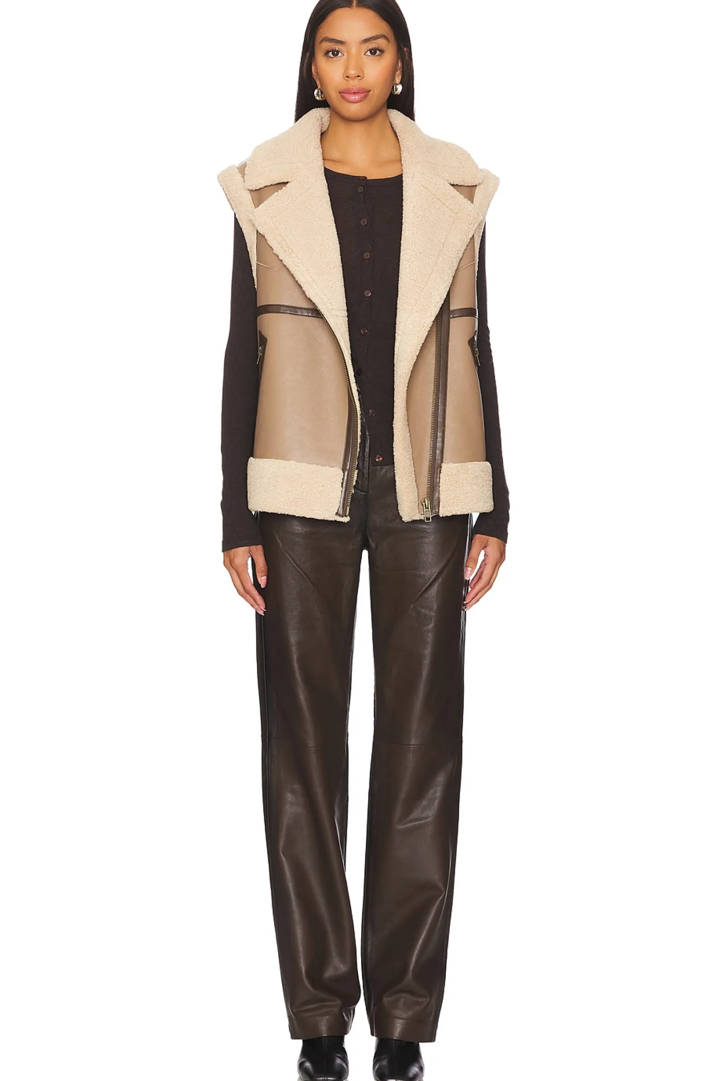 Self: 65% polyurethane 35% polyester Lining: 100% polyester Trim: 50% polyurethane 50% cotton.Made in China.Dry clean only.Exposed front zip closure.Side pockets with zip closure.Faux leather and faux fur