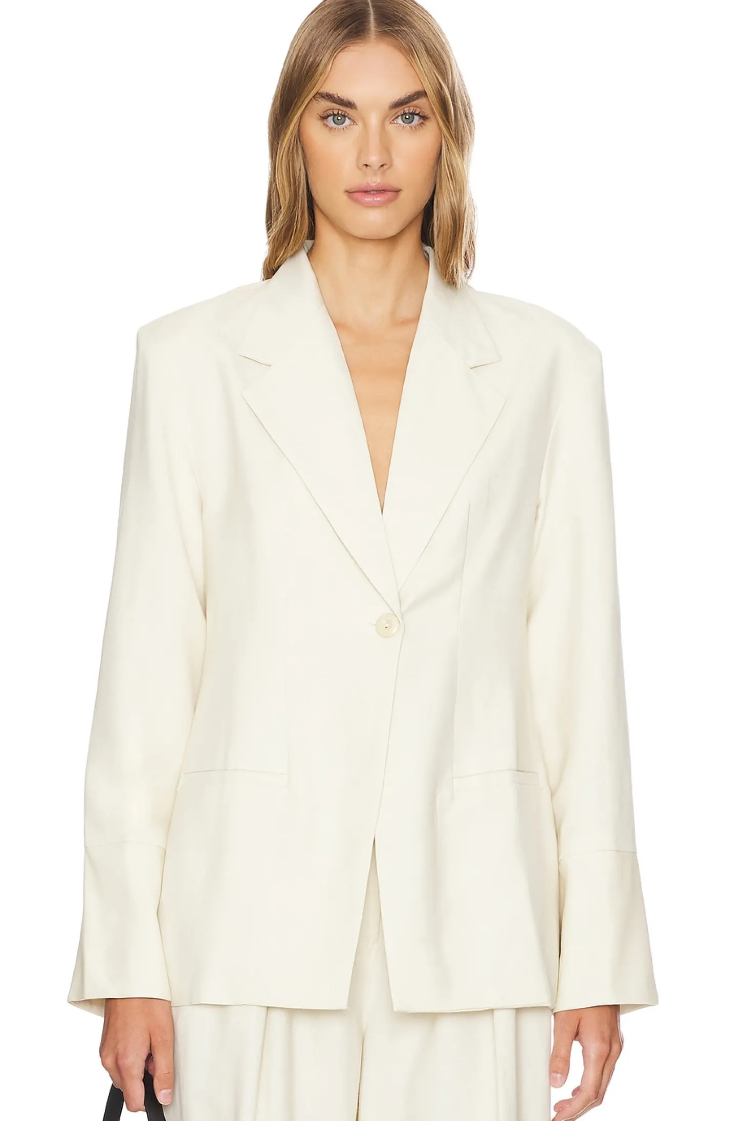 Self: 75% viscose 25% linen Lining: 100% rayon.Made in Indonesia.Hand wash.Front button closure.Light padding at shoulders.Front welt pockets.Slit design at cuffs Item not sold as a set