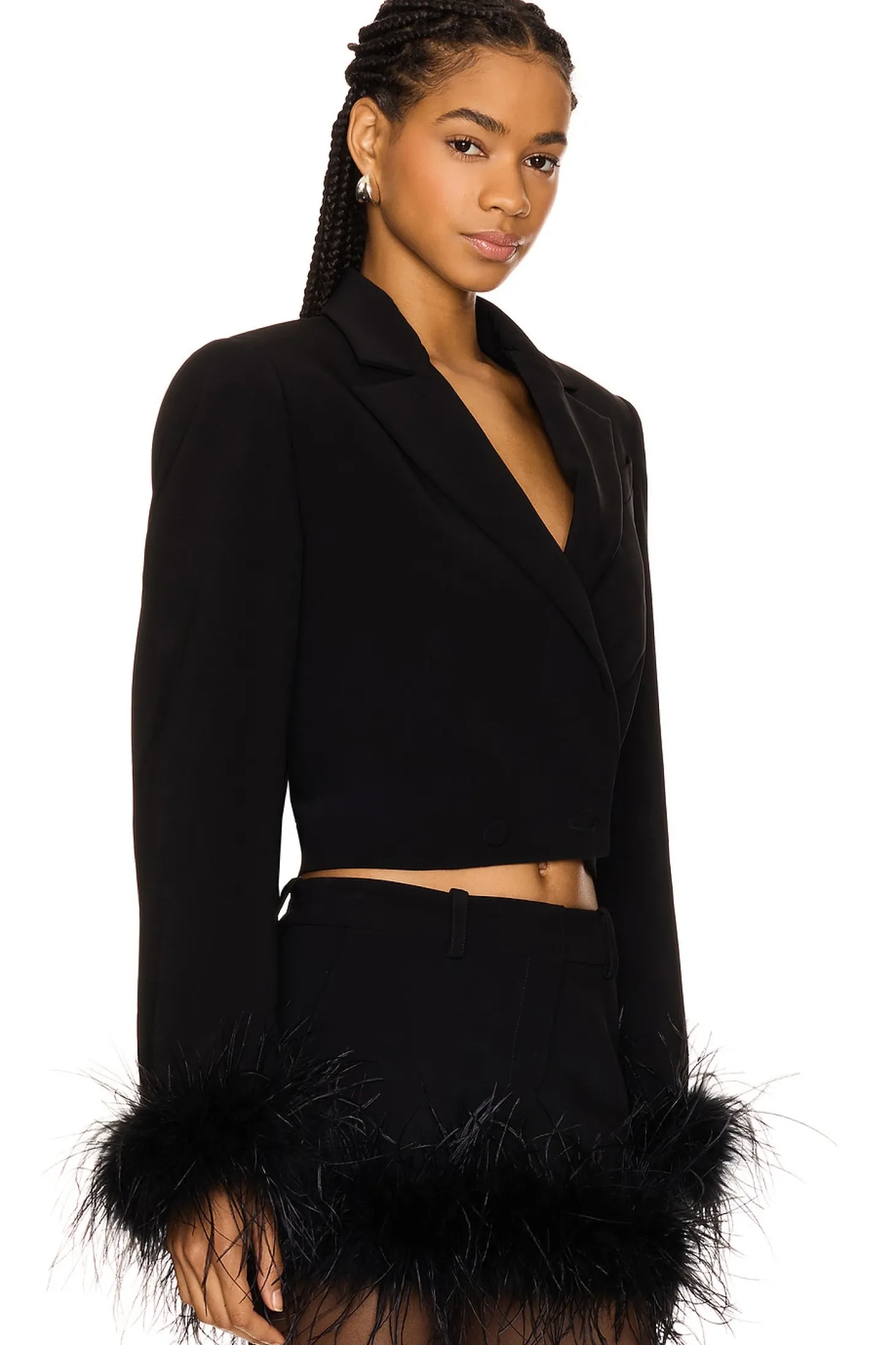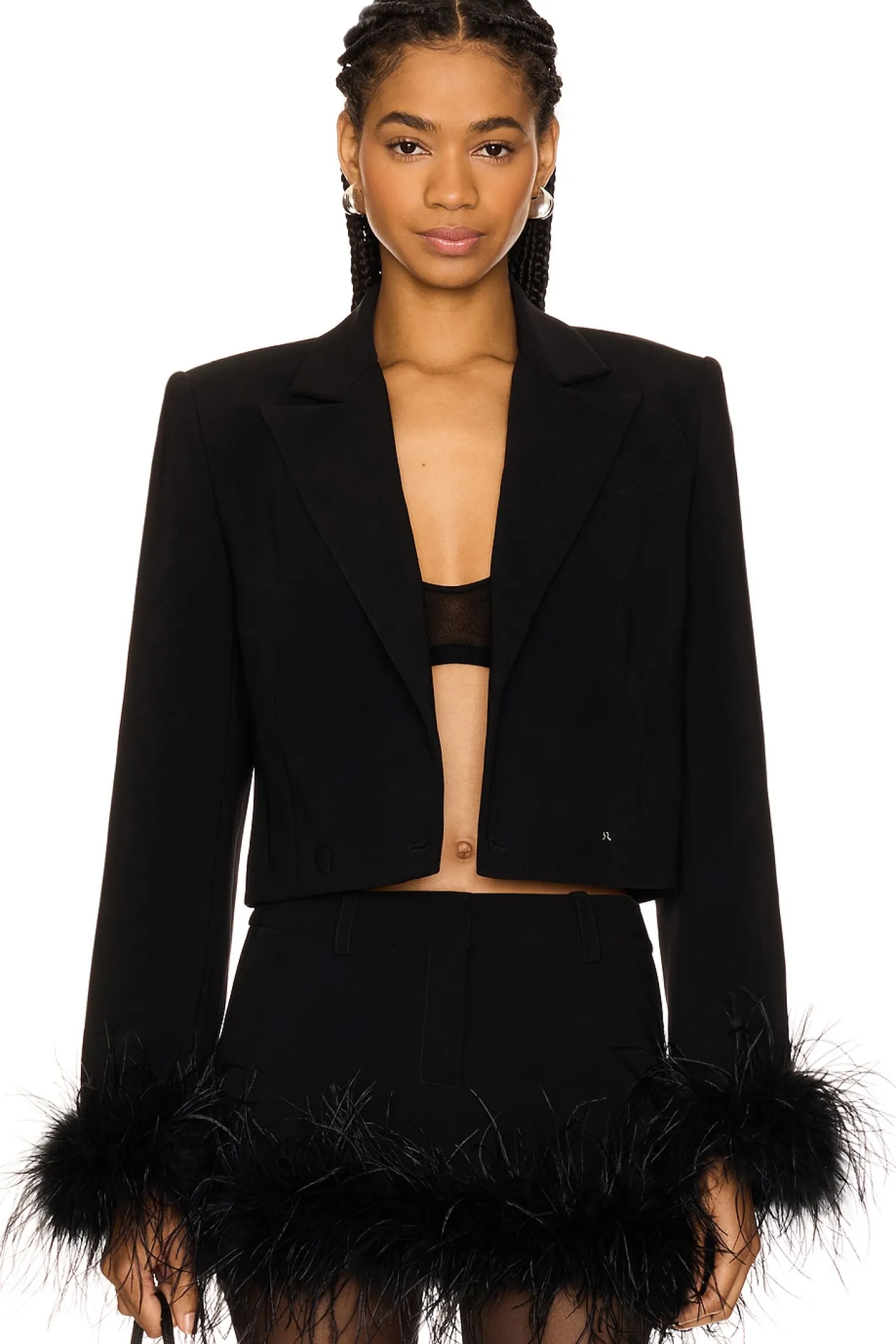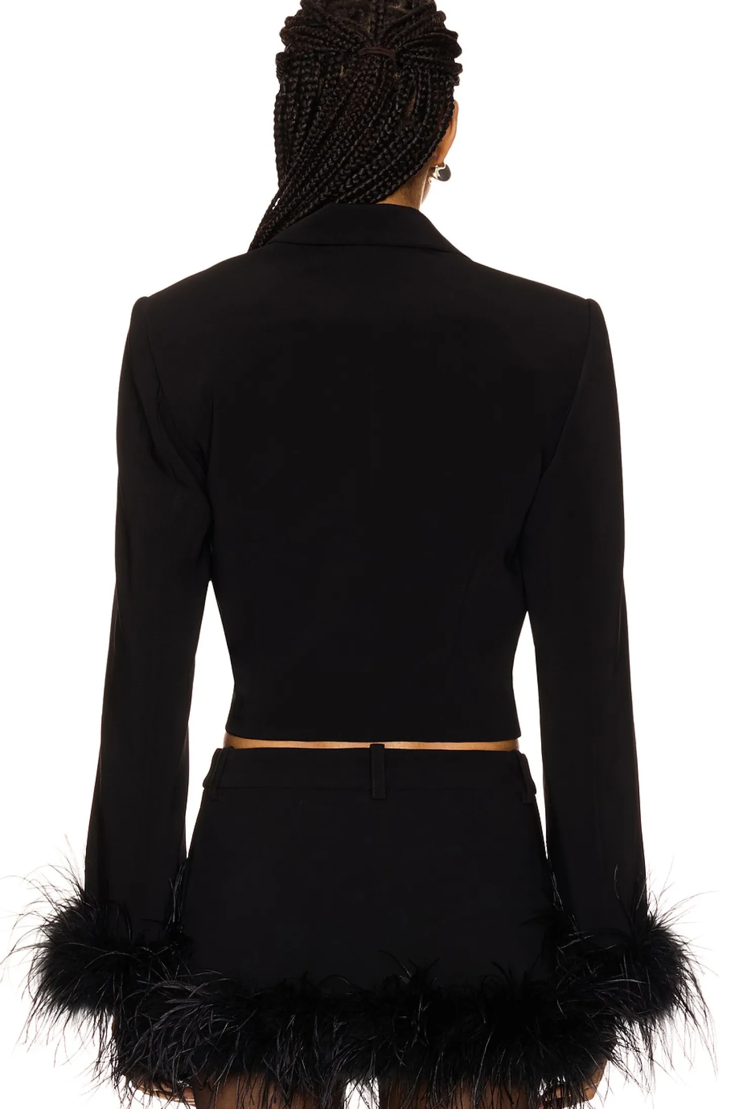 Self: 91% polyester 9% elastane Lining: 97% polyester 3% elastane Trim: 100% real feathers.Made in China.Dry clean only.Front button closure.Faux breast welt pocket Padded shoulders and notched lapel collar.Heavyweight crepe fabric with feather trim Item not sold as a set