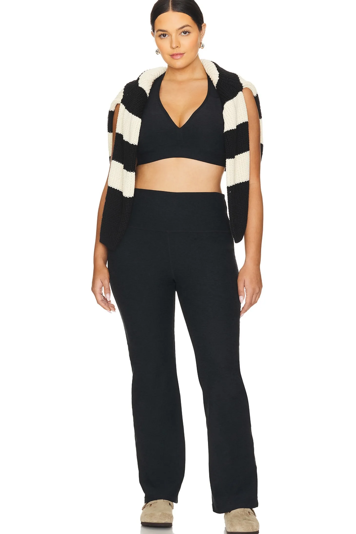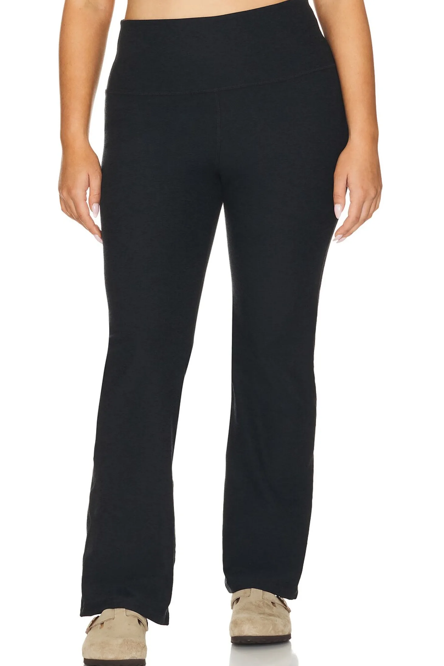 87% polyester 13% elastane.Made in USA.Machine wash.Pull-on styling.Stretch jersey spandex fabric.Item not sold as a set.16.5" at the knee breaks to 19" at the leg opening