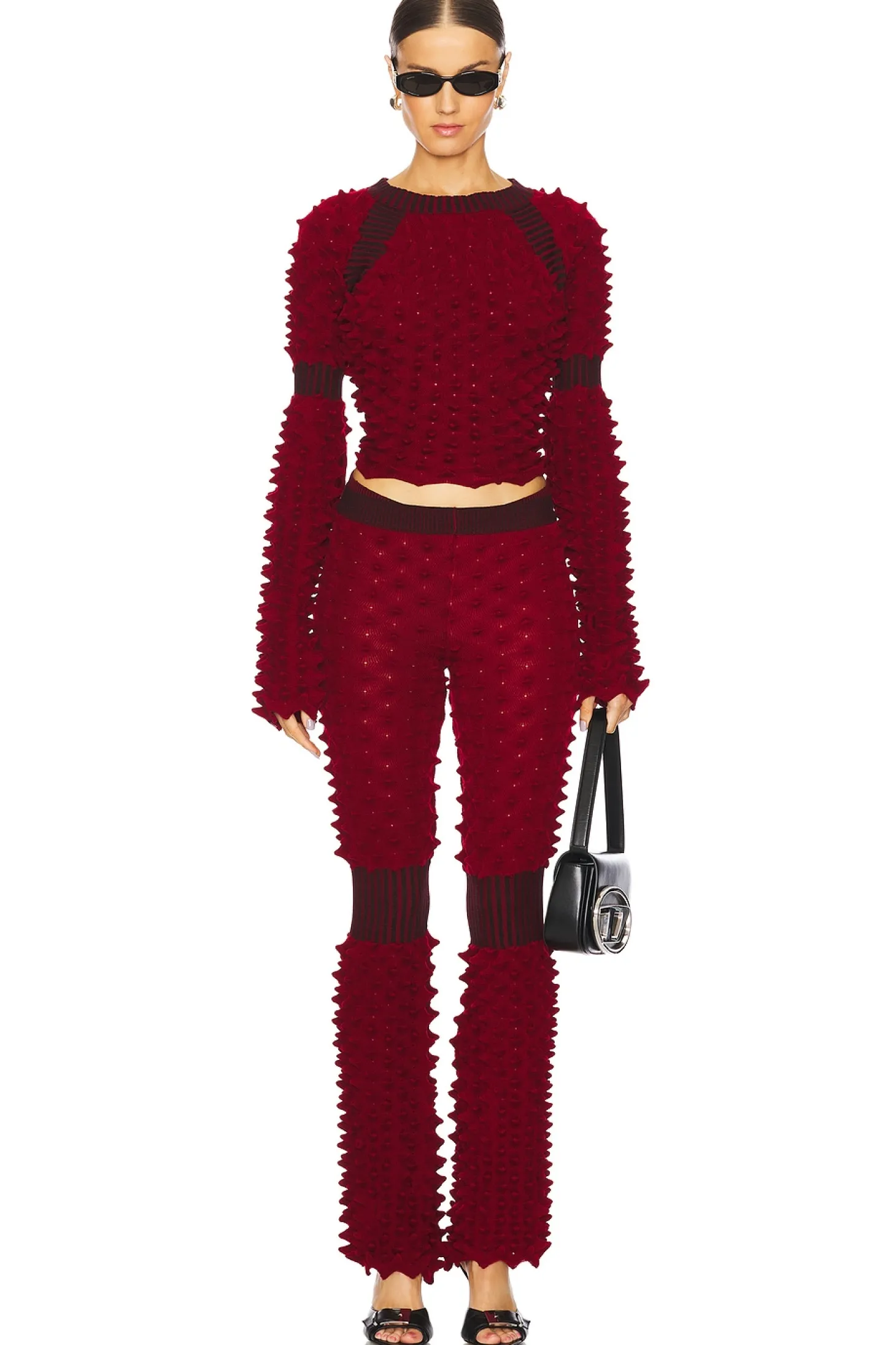 89% merino wool 11% polyamide.Made in Italy.Hand wash.Pull-on styling.3D textured design fabric.Midweight ribbed knit fabric Item not sold as a set.6" at the knee breaks to 16" at the leg opening