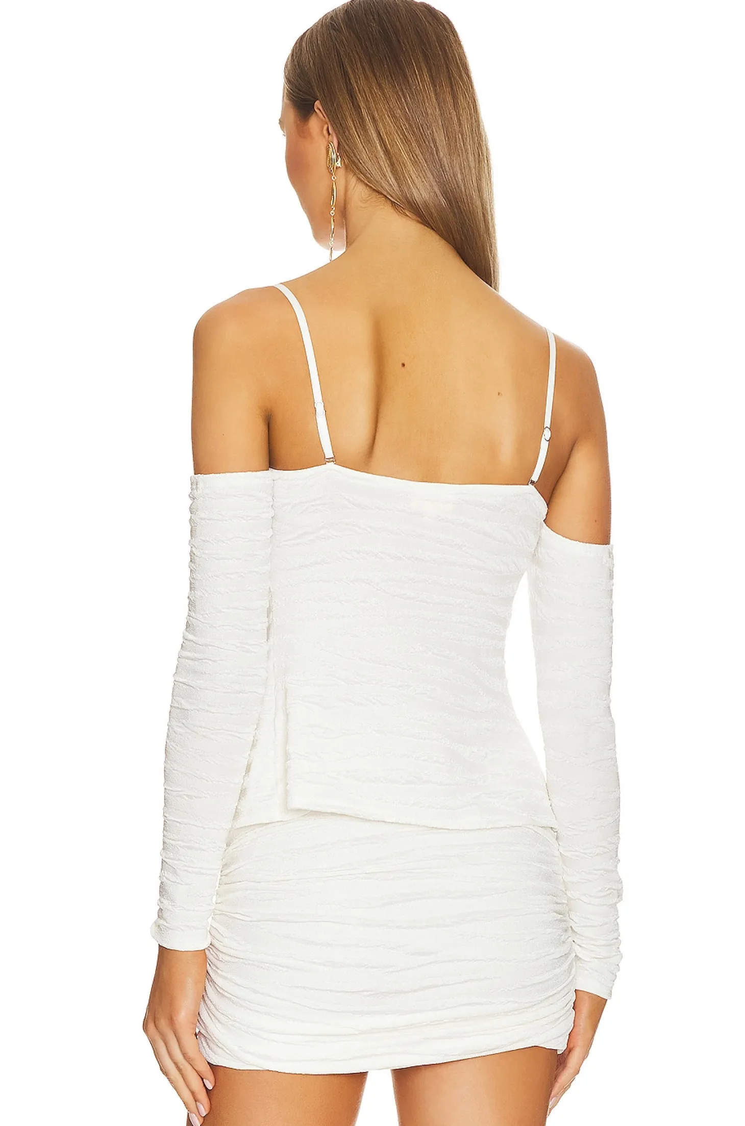 Self: 95% polyester 5% spandex Contrast Fabric: 97% polyester 3% spandex Lining: 92% polyester 8% spandex.Made in China.Dry clean only.Front cut-out with tie closure.Off the shoulder styling.Adjustable straps.Lightweight fabric with asymmetrical hem.Item not sold as set