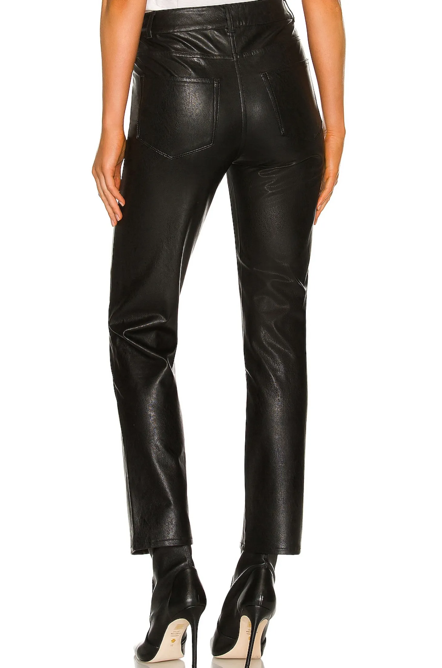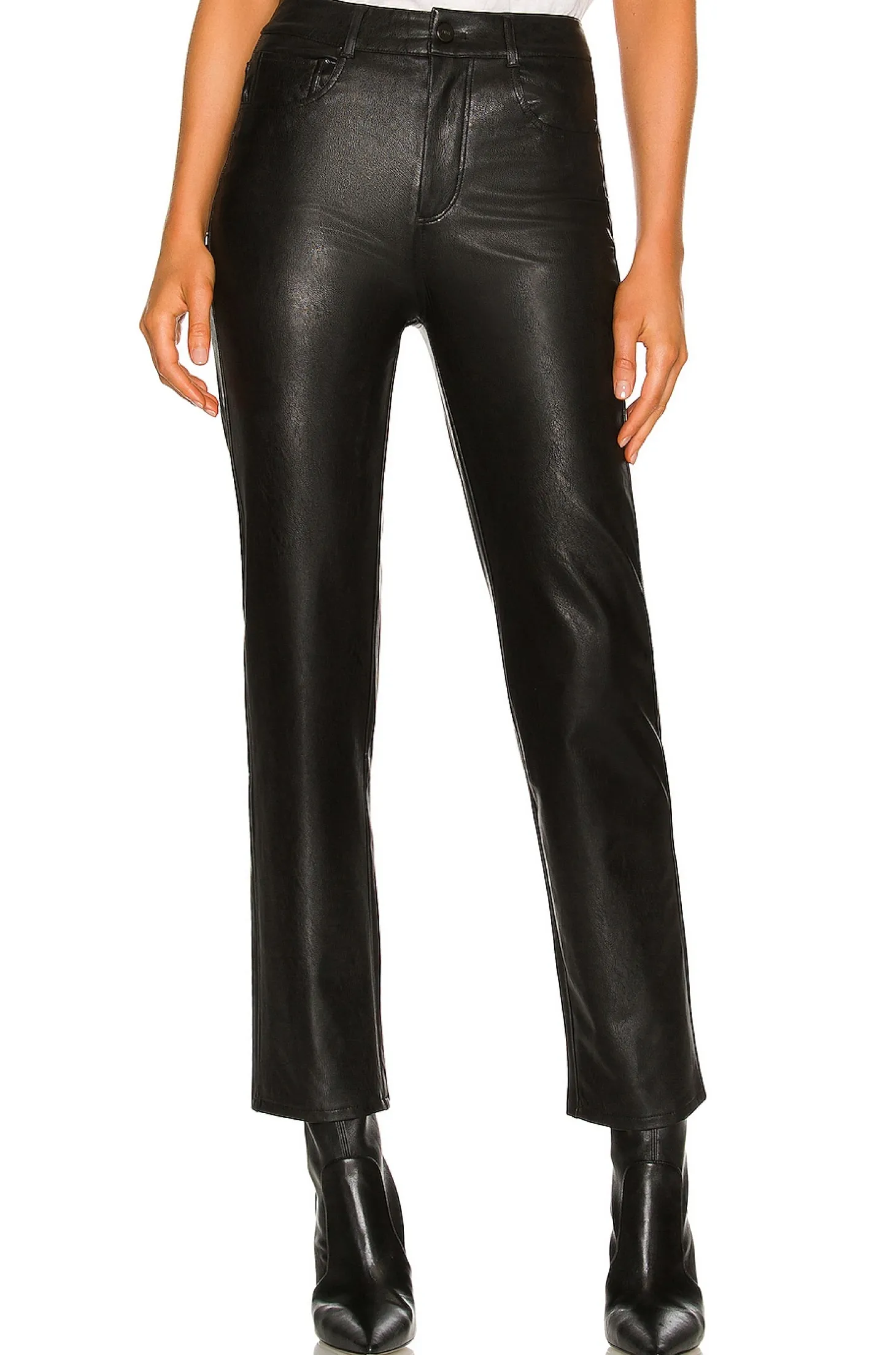 Self 1: 100% polyurethane Self 2: 94% poly 6% spandex.Made in China.Machine wash.Zip fly with button closure.5-pocket design.Faux leather fabric.15.5" at the knee narrows to 14" at the leg opening