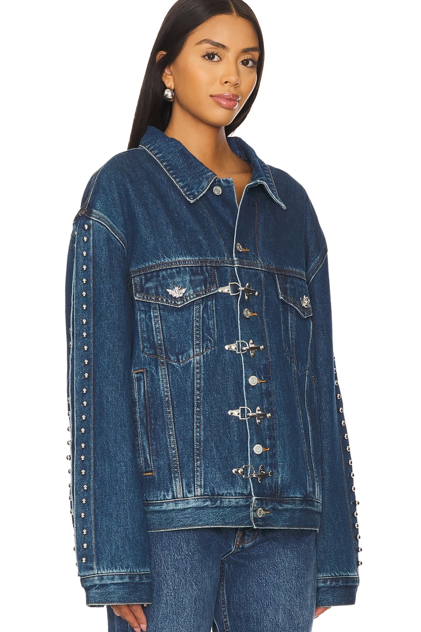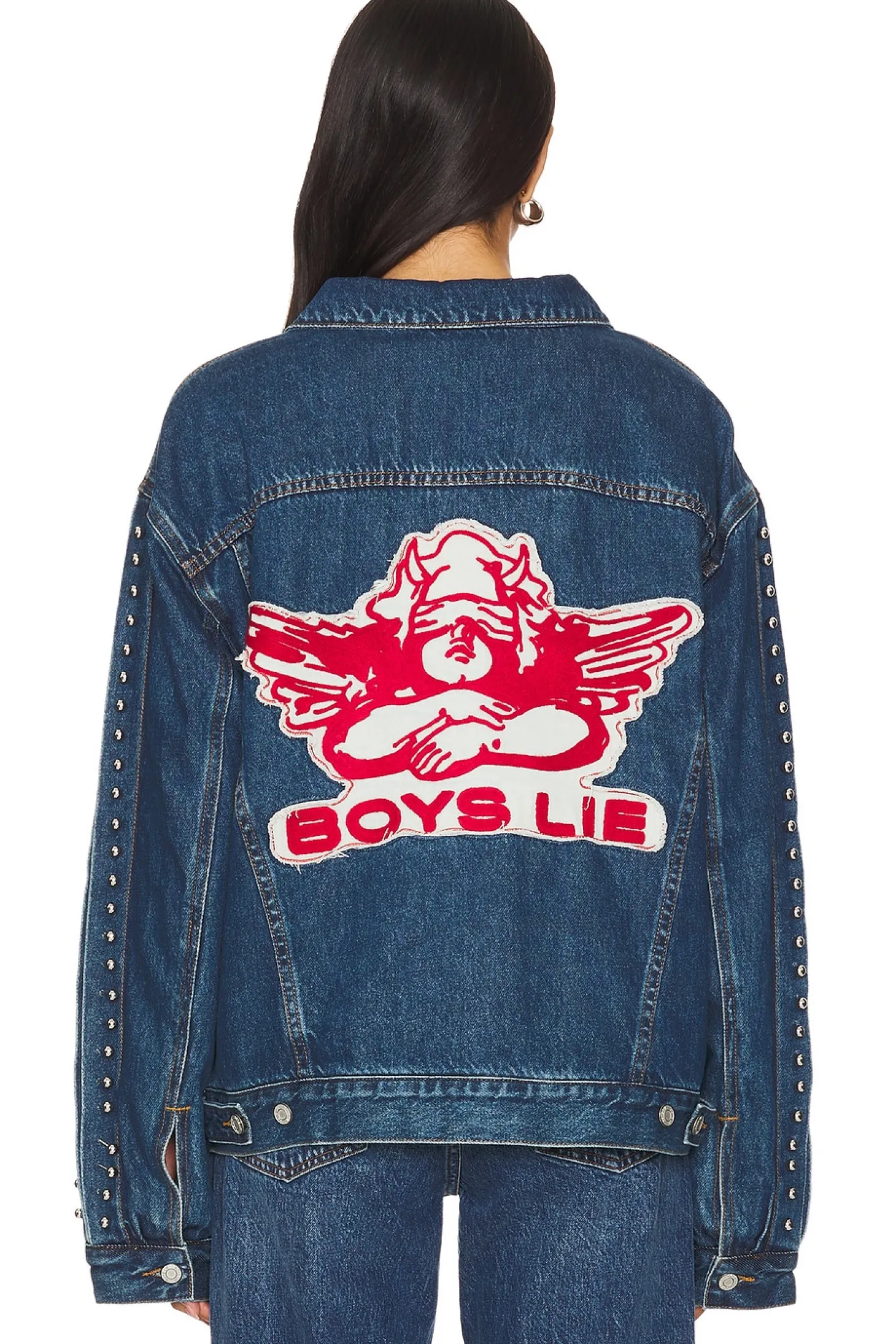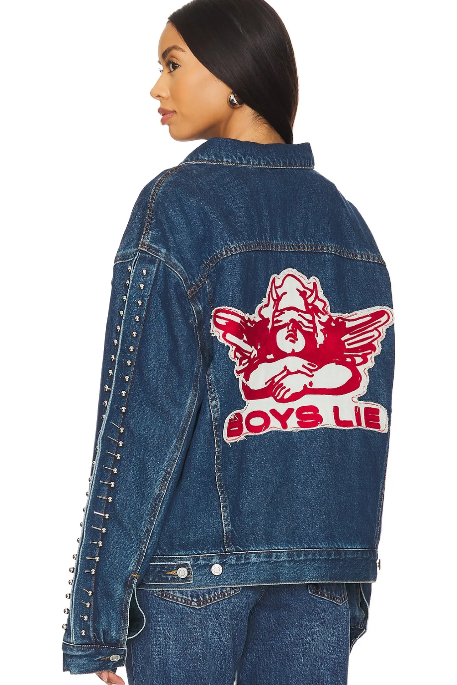 Self: 100% cotton Lining: 75% cotton 18% rayon 8% polyester Fill: 100% polyester.Made in China.Dry clean only.Front button and lobster clasp closure.4-pocket design.Silver-tone Boys Lie decal at breast flap pockets.Back Boys Lie logo detail.Midweight denim fabric